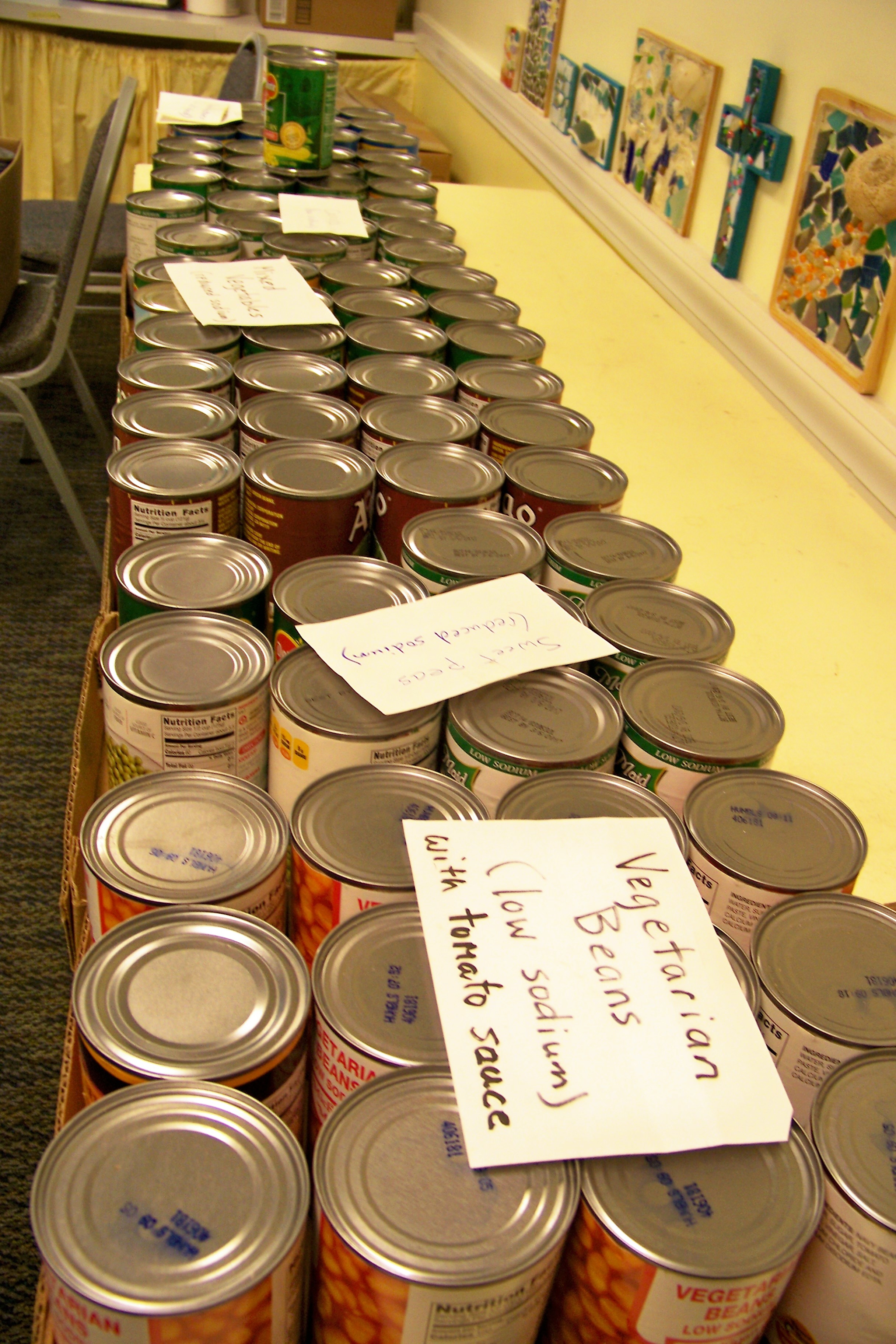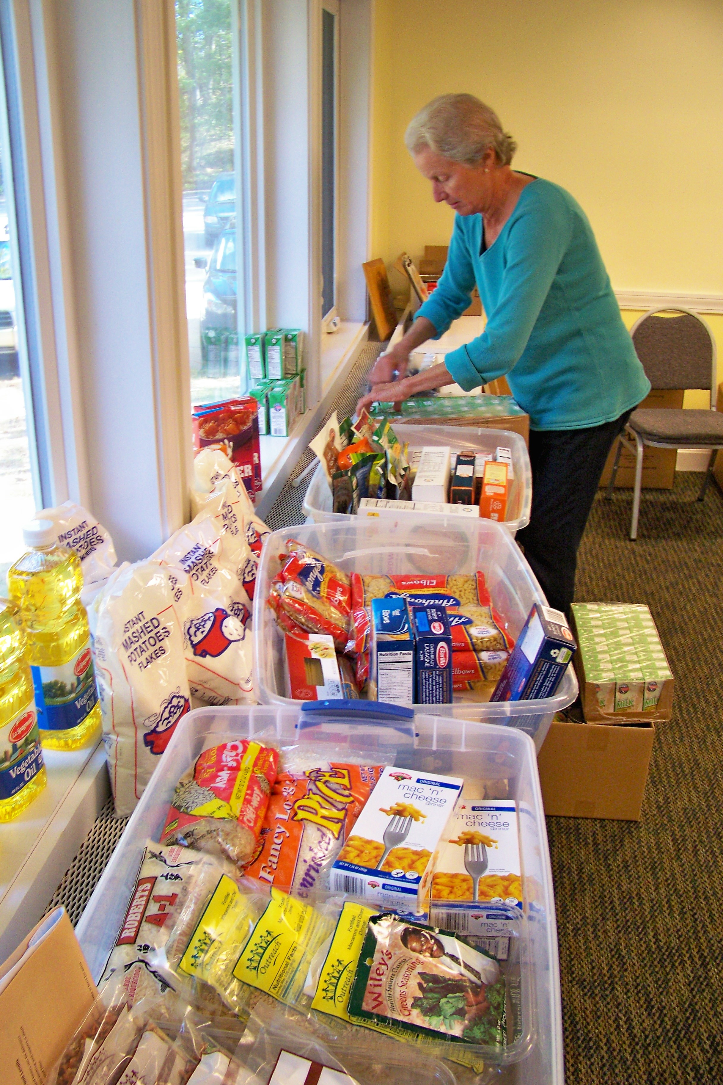 Non-perishable items should be placed in the shopping cart in Fellowship Hall of the church or inside bags inside the door along the back hallway.