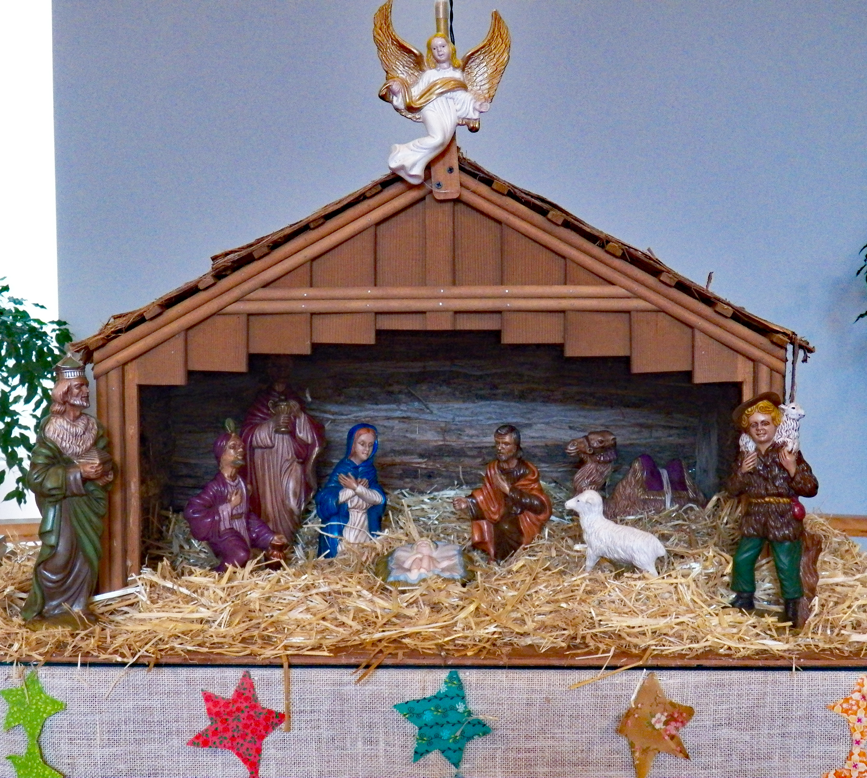 The stars beneath the nativity were created by our Sunday School, using left-over fabric from last January’s Dress-a-Girl-Around the World mission during which women from our church created more than 100 dresses.