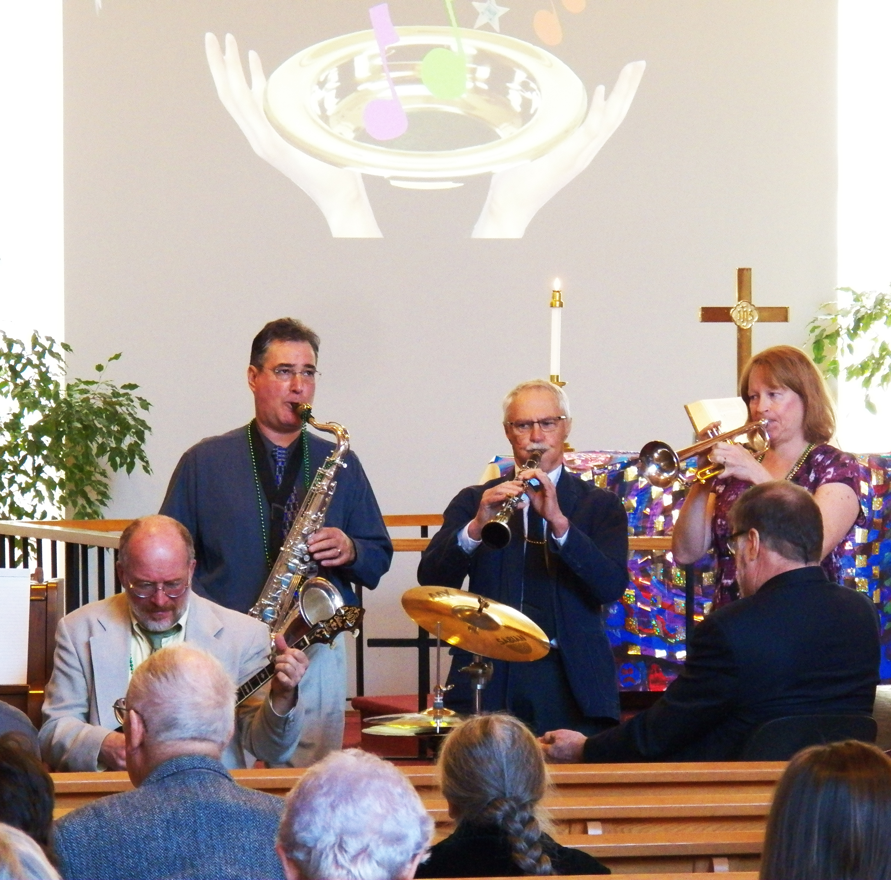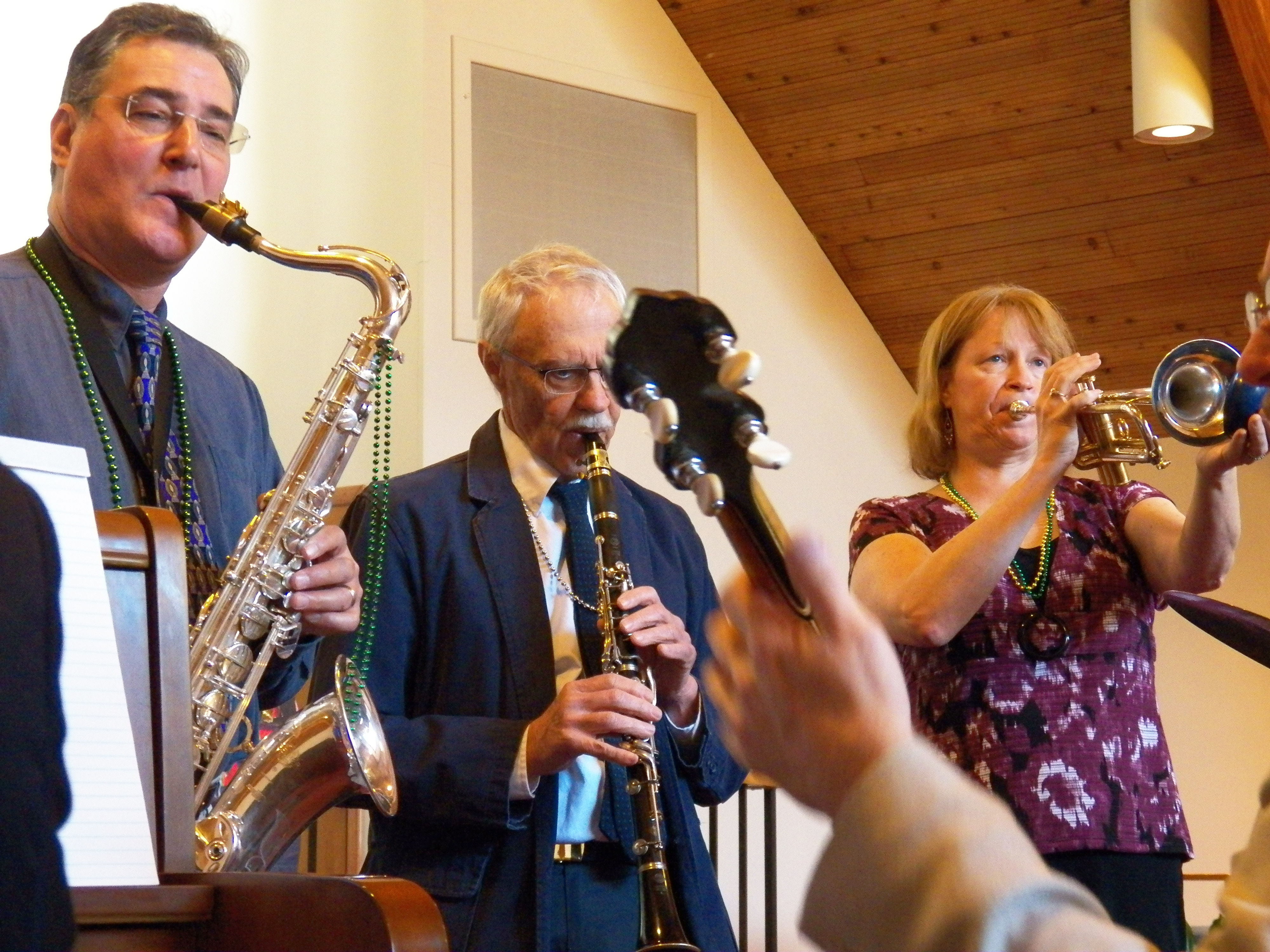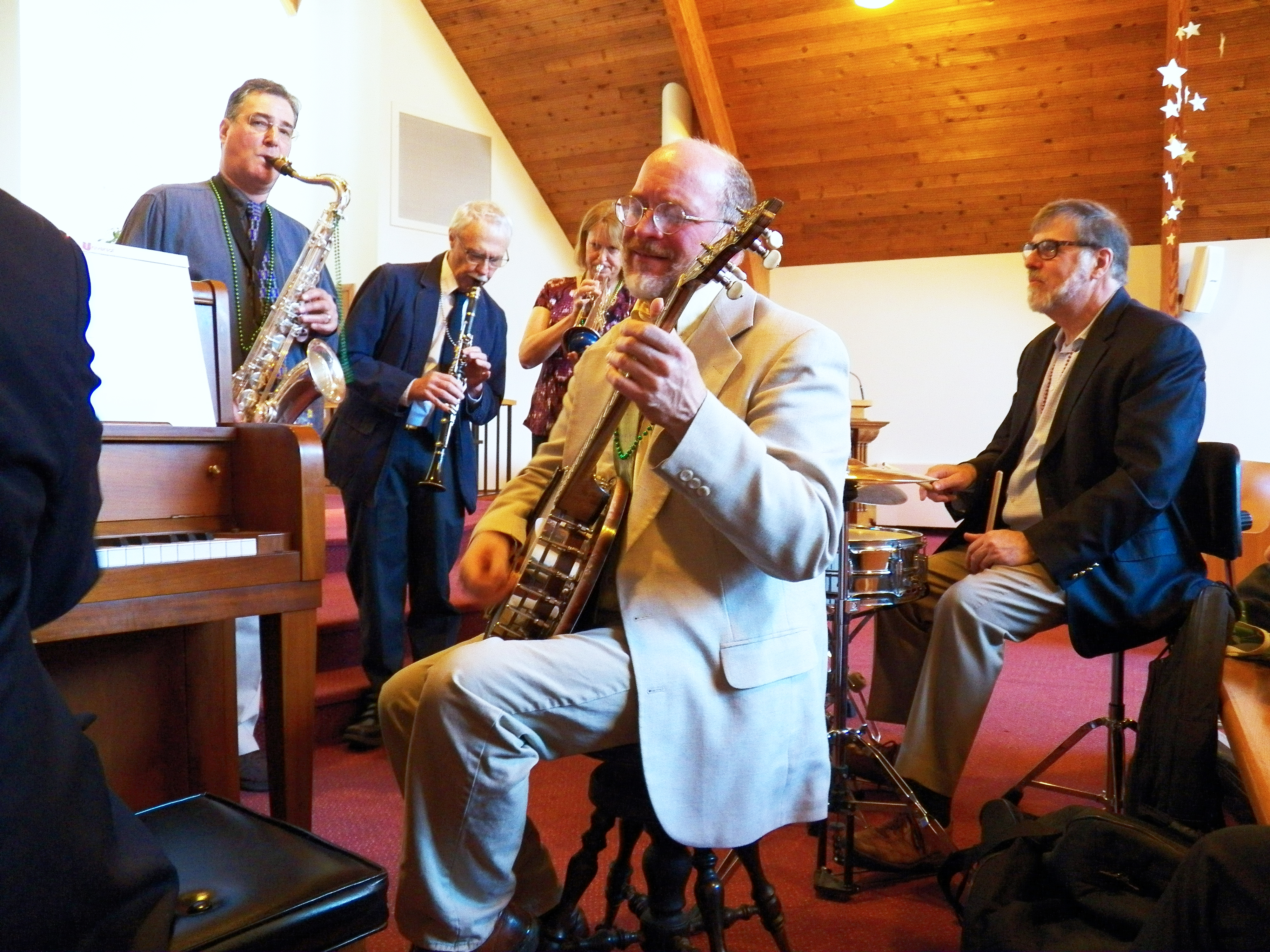 And complementing every blast from Michele Kingston’s trumpet and every strum from Peter Dumphy’s banjo, our choir, led by Faith York, was was in high spirits, as was the organ playing of Gail Parker and Tyler Roddenberger, who helped rock the Sanctuary when the rest of the musicians let loose with “When the Saints Go Marching In.”