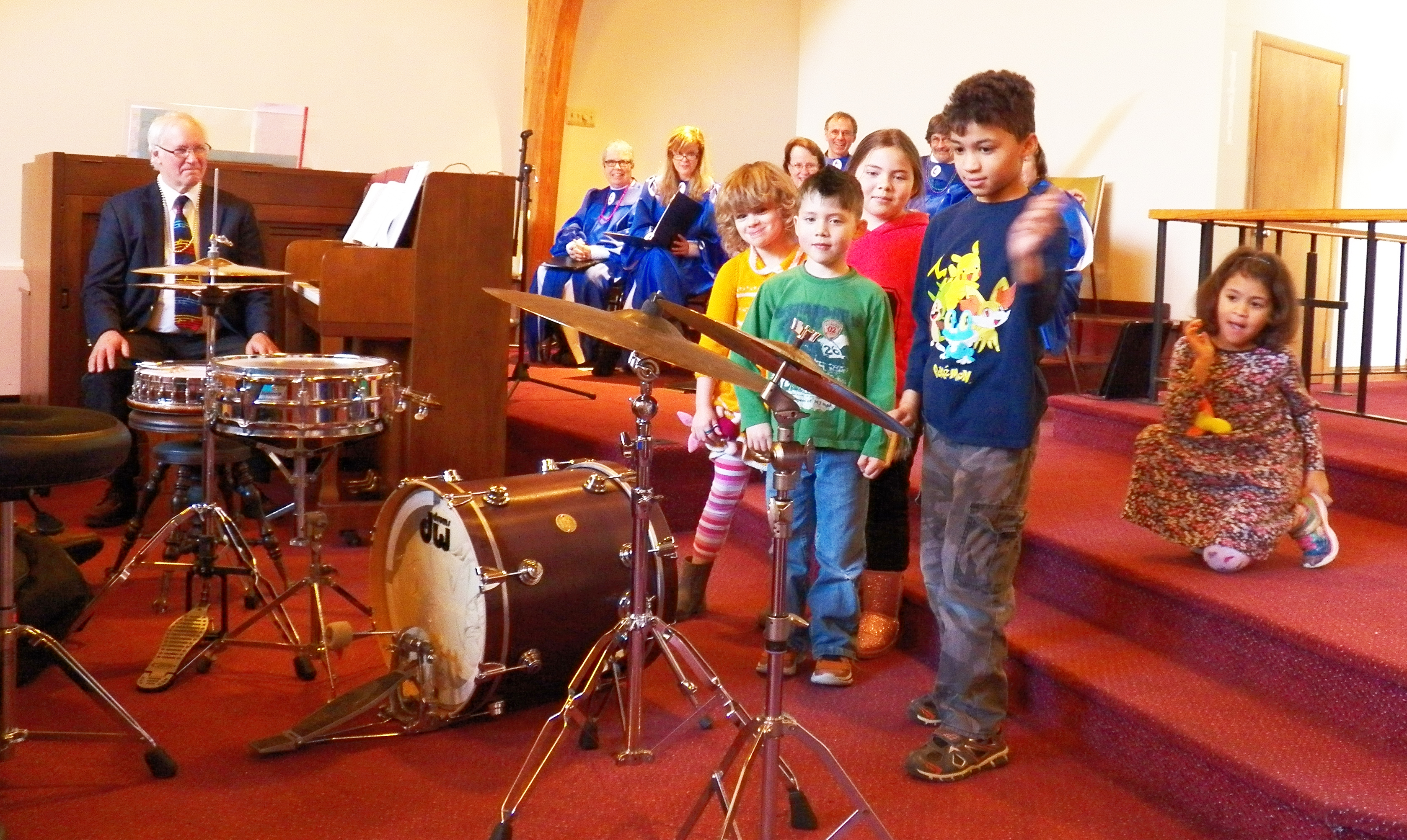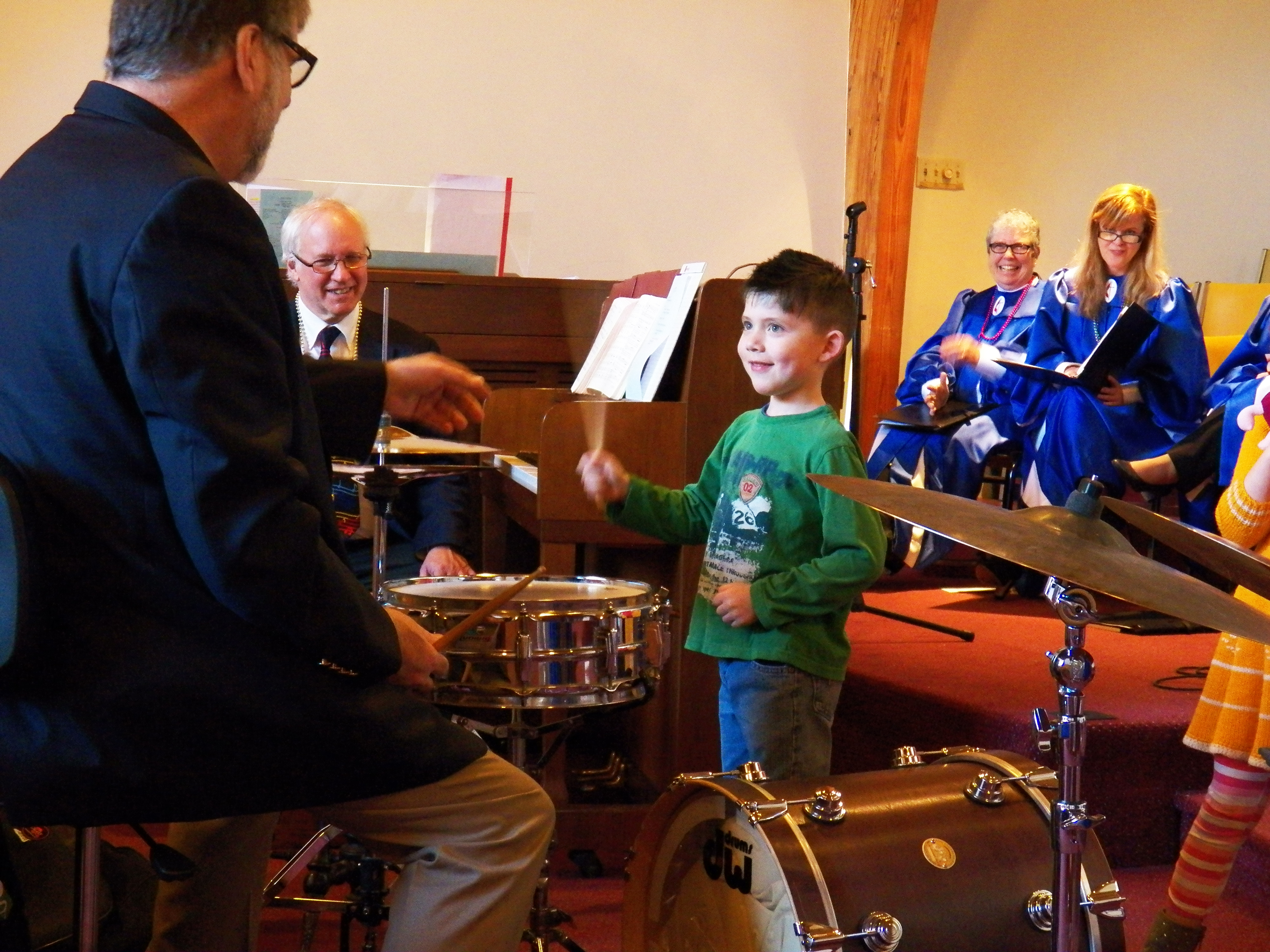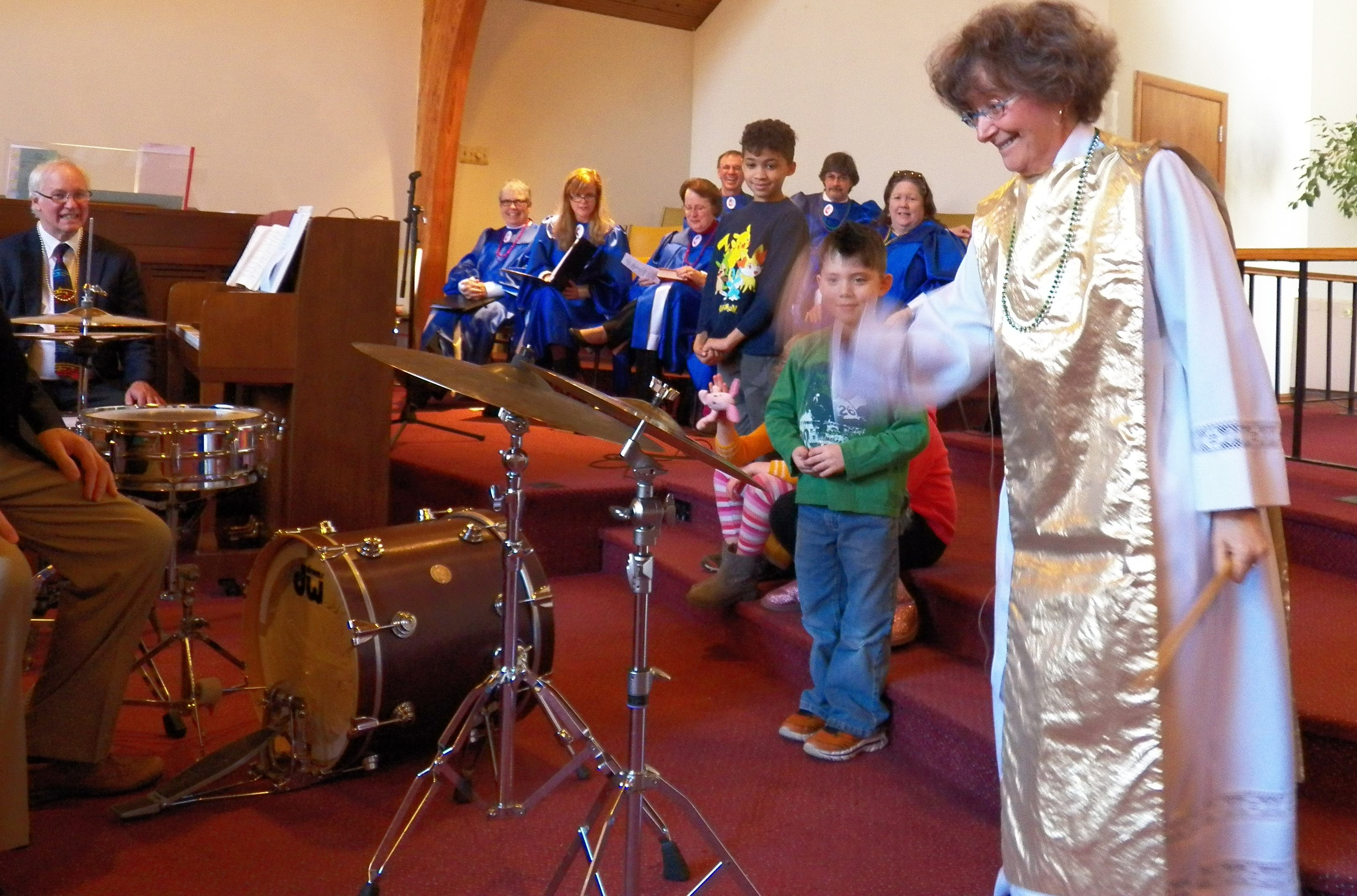 She then asked drummer Paul Aronson to talk with the children about how he plays the cymbals. One by one he had the children approach his drum set and after handing them his drum sticks, he instructed them to give the cymbals a rap. At first there were only a few tentative taps, but it wasn’t long before the Sanctuary was ringing with the cymbals’ vibrations. It was indeed a joyful noise.