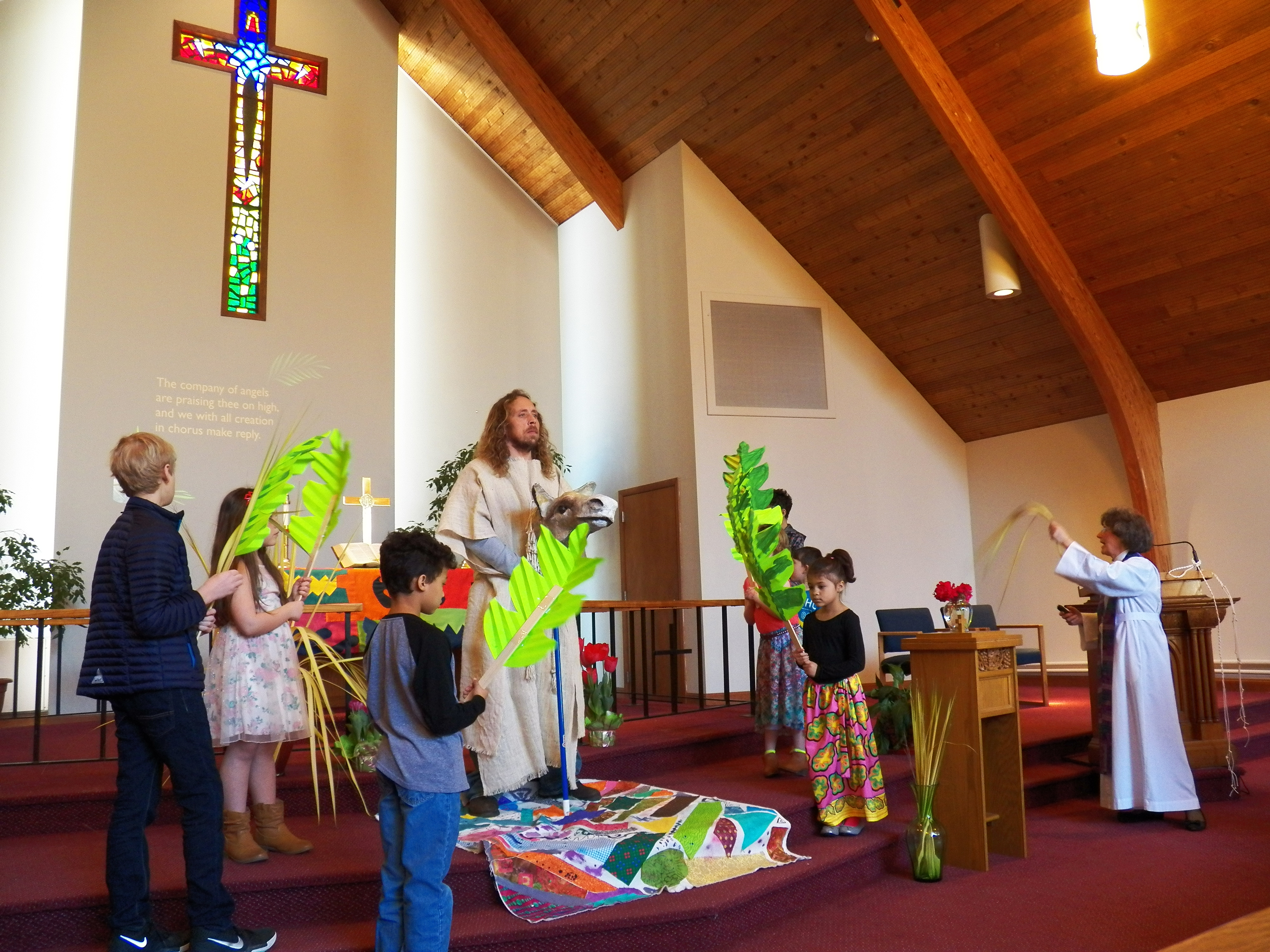 The procession ended in front of the altar with Jesus standing on a large “garment,” placed at his feet by the children who had created it in Sunday School.
