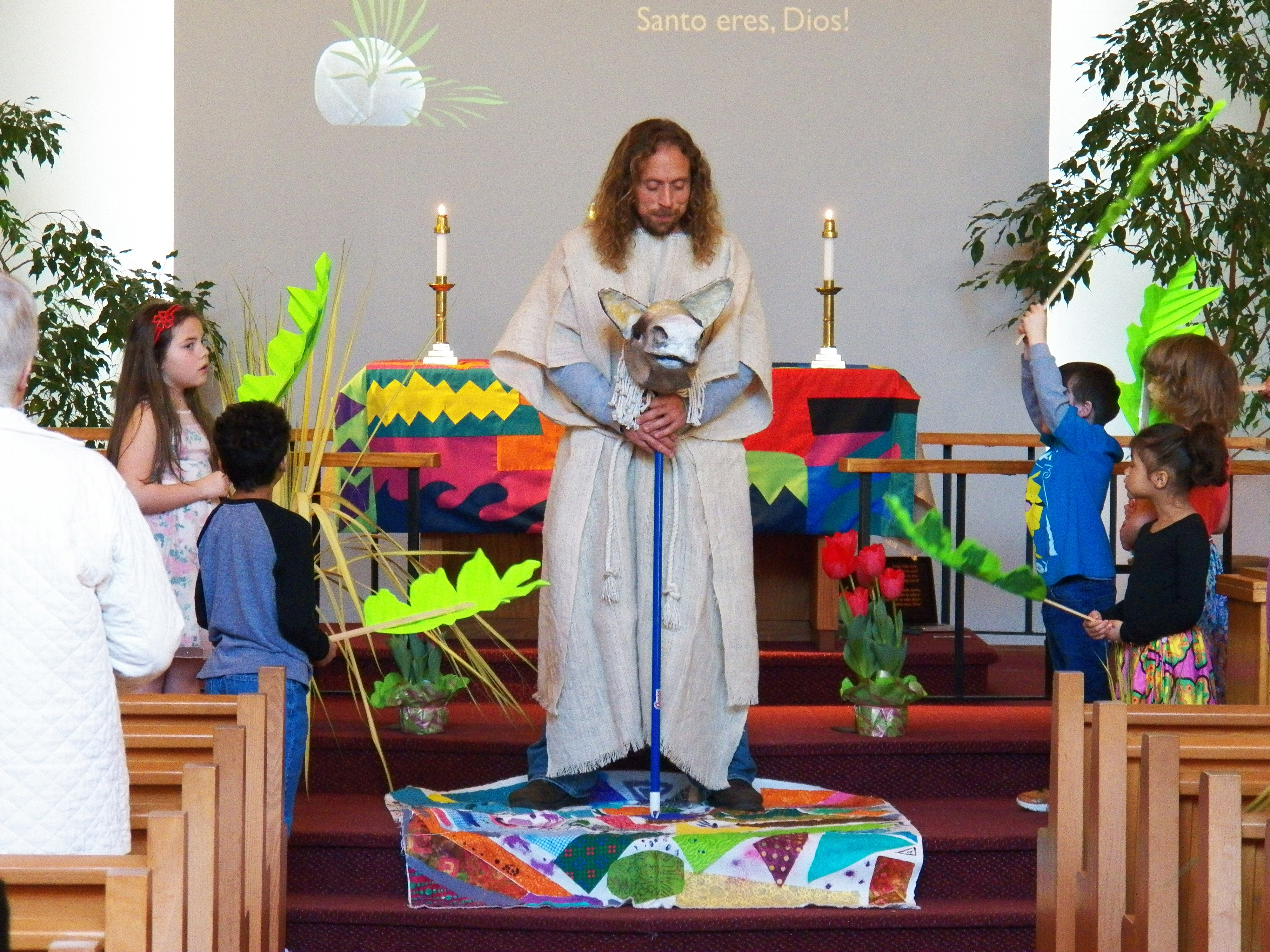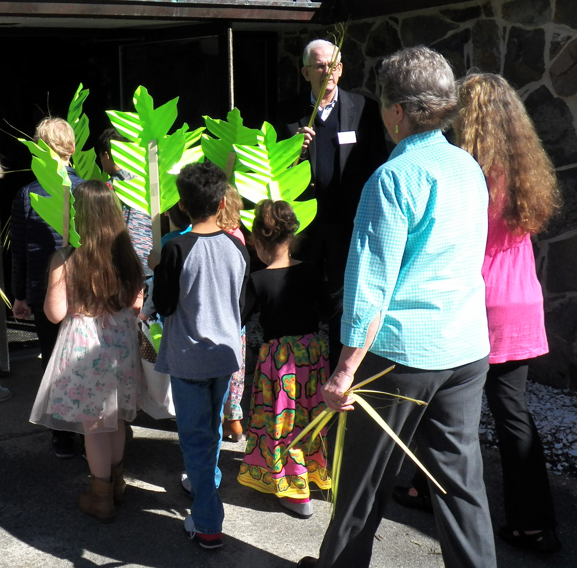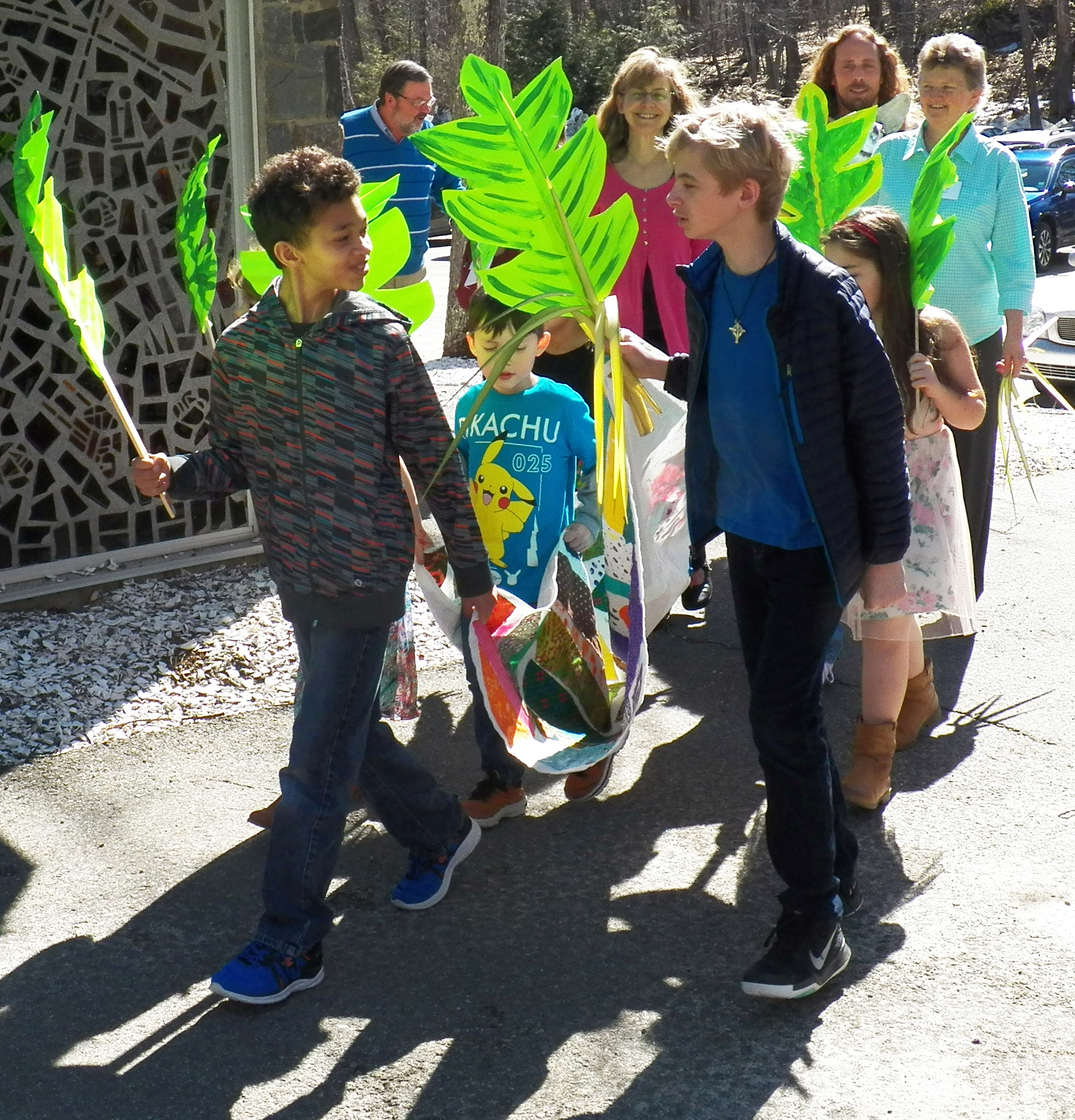 For the Palm, Sunday service in the Sanctuary, church members joined the choir and children from Sunday School in a parade that went out the back door of the church, wrapped around the building, entered the front door into the Narthex and then procceded into the Sanctuary.