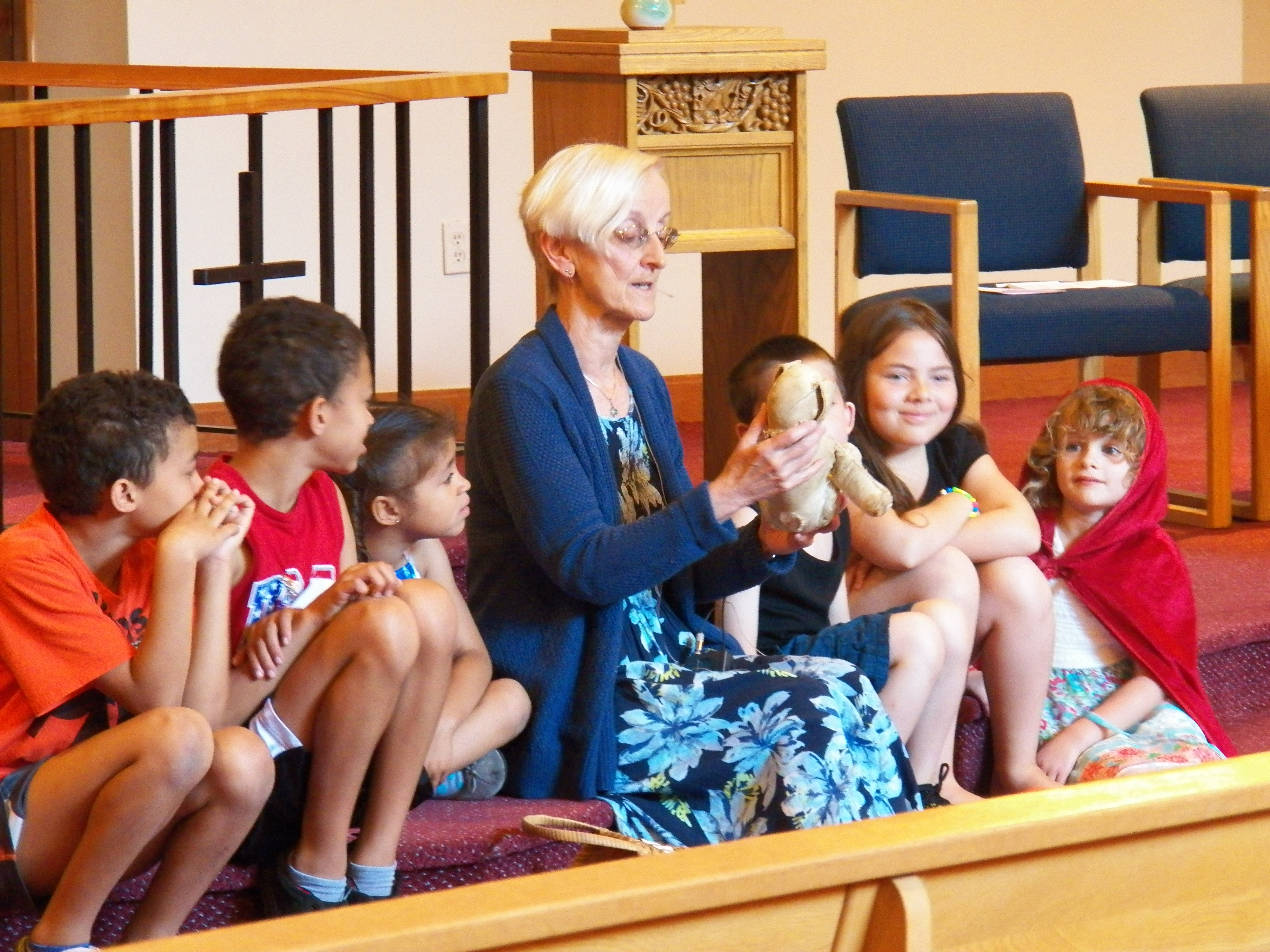 During Children’s Time at the second service, Casey talked about finding a friend for comfort whenever you’re afraid or anxious. Casey explained that one such “friend” for her is a much-loved stuffed (many times) dog she was given by her grandfather when she was 3. The dog’s name is Wendy and Casey pulled Wendy from a basket during the service and shared held her lovingly to show all the children.