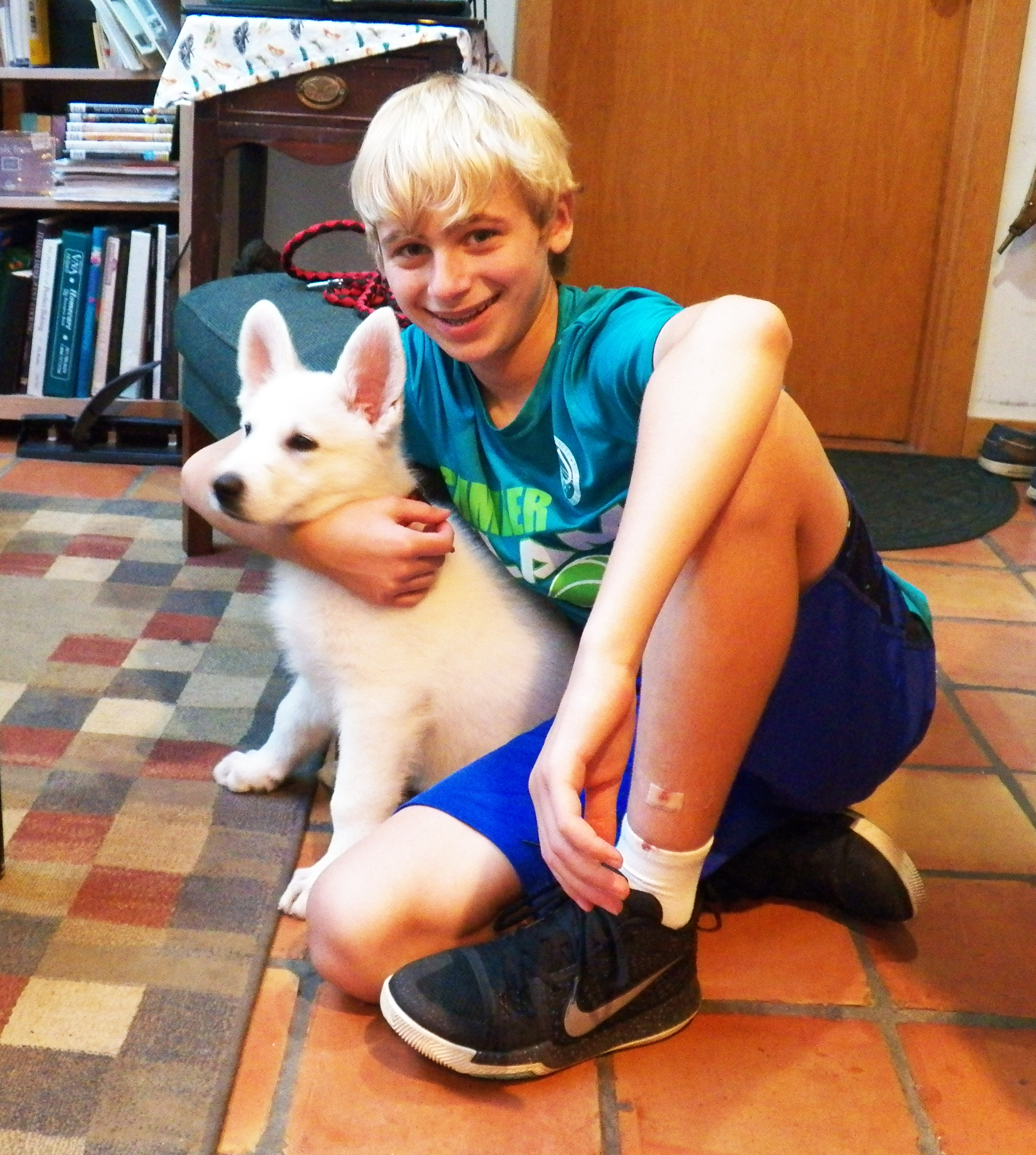 In addition to the 28 people who attended the Braun’s Open House, three well-behaved dogs were in attendance: Piper belonging to Margaret and Mark, Olivia belonging to Betty Jane Shreve, and Hyggelig Dag, the new white German shepherd belonging to Jasper Fontana (above). Hyggelig is Norwegian for “good day.”