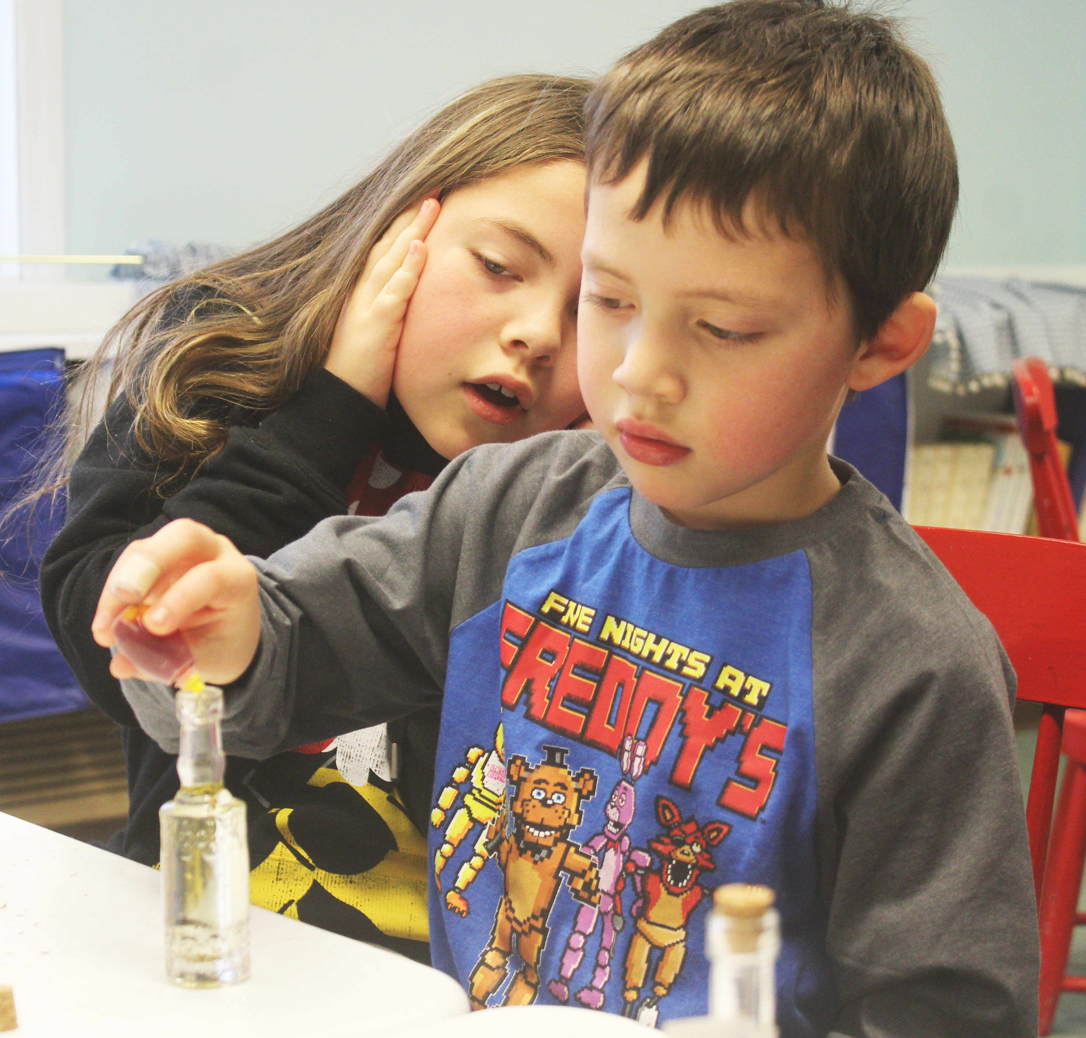 After the feet washing, Deanne helped Maddie and Mason simulate making the Nard perfume described in the Mary and Jesus story. In ornate bottles, they mixed vegetable oil, herbs, orange-flavored oil and food coloring.