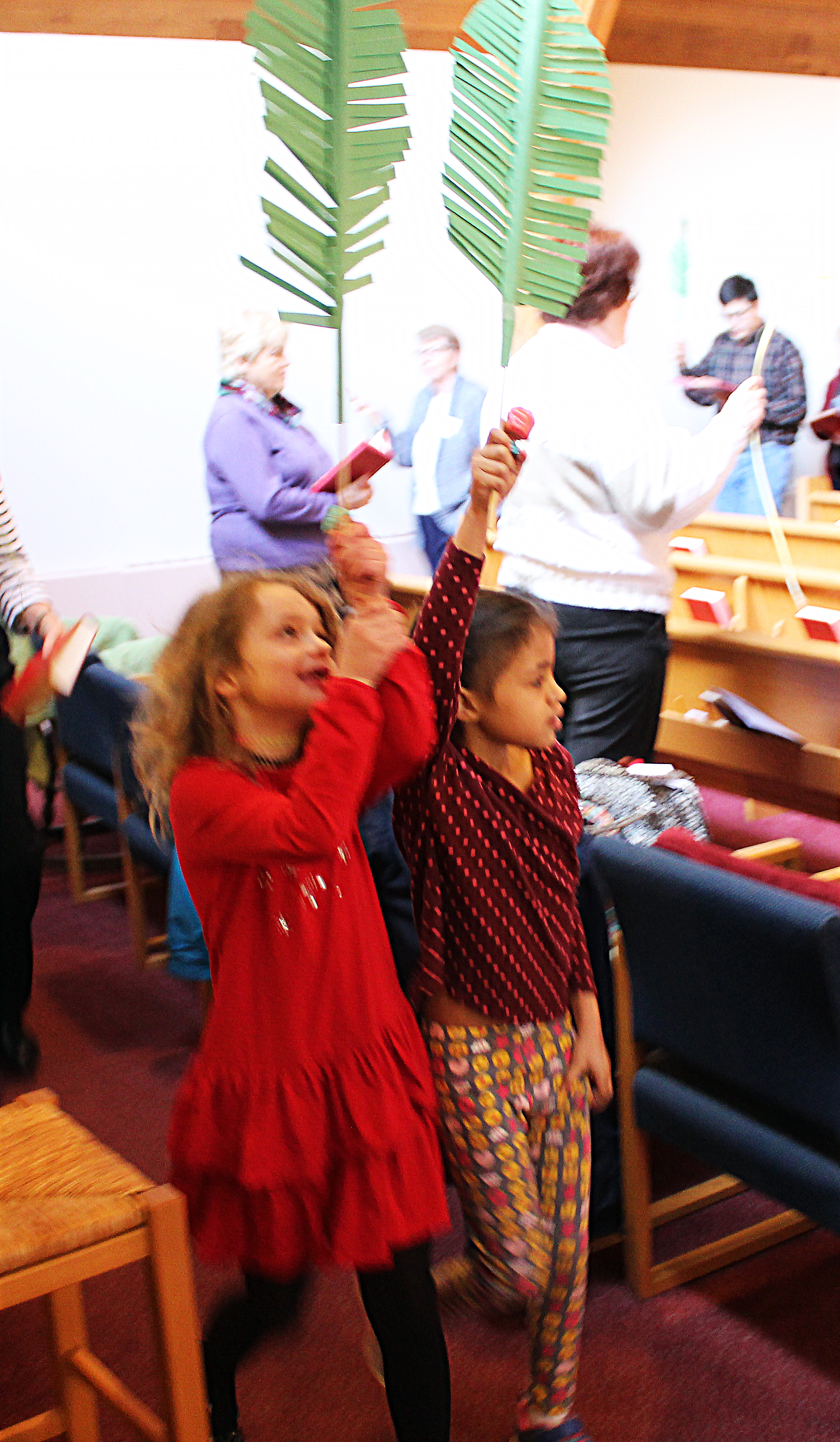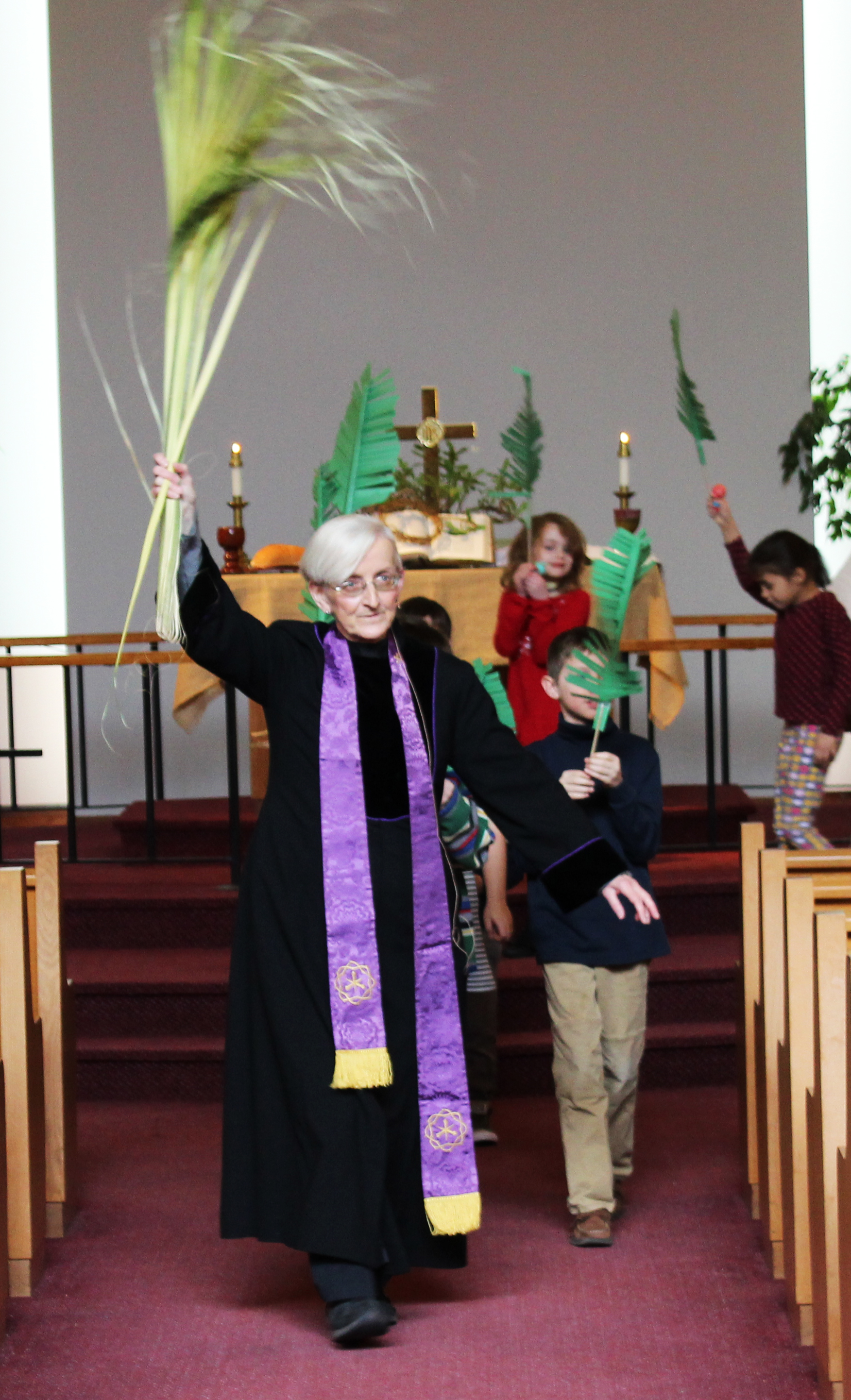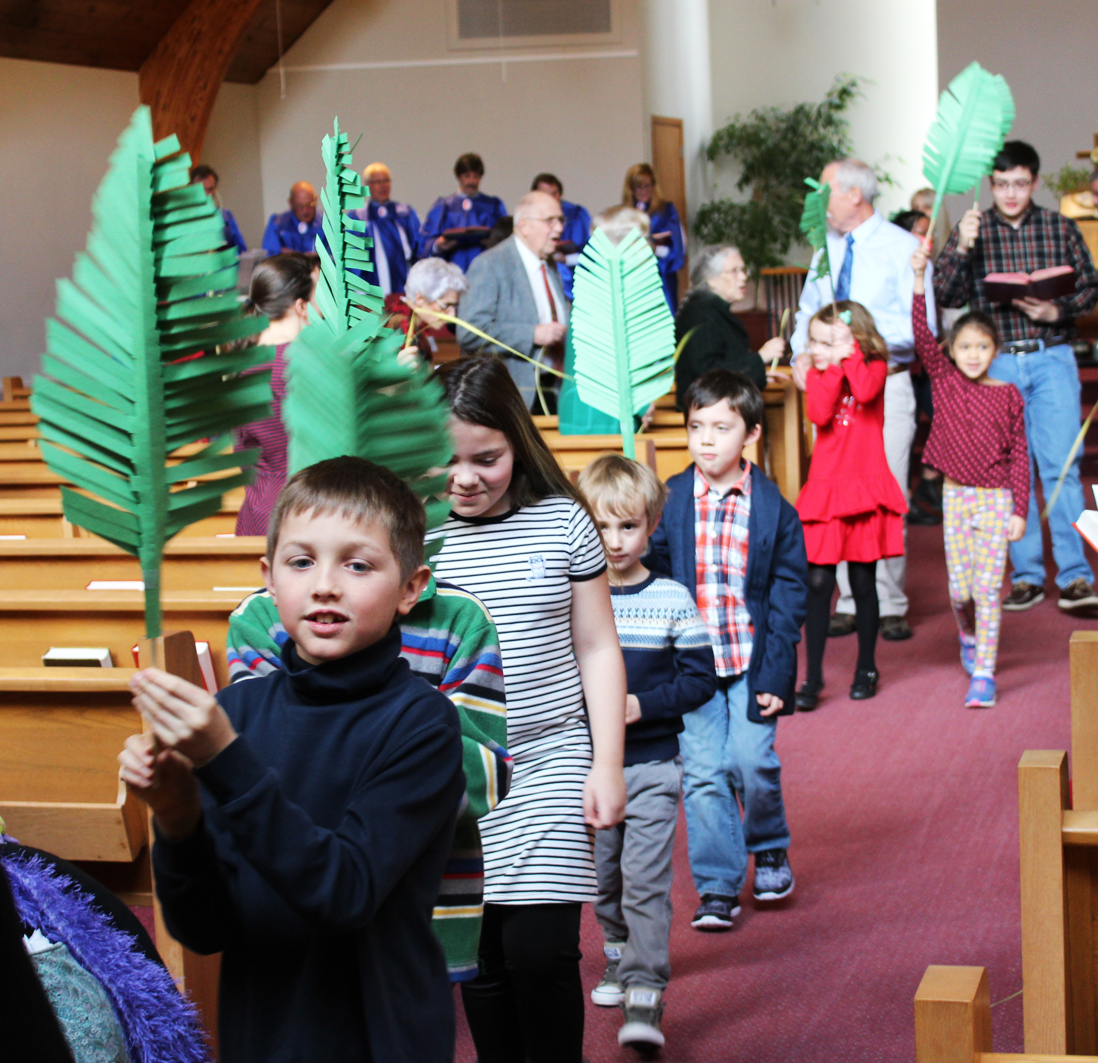 For her Children’s Story on Palm Sunday, the Rev. Casey Collins asked the children what they knew about Palm Sunday and Jesus riding into Jerusalem on a donkey. After listening to their answers (including one young boy asking if there were security guards), Pastor Casey led the children and the entire congregation on a procession around the sanctuary, waving palms along the way.