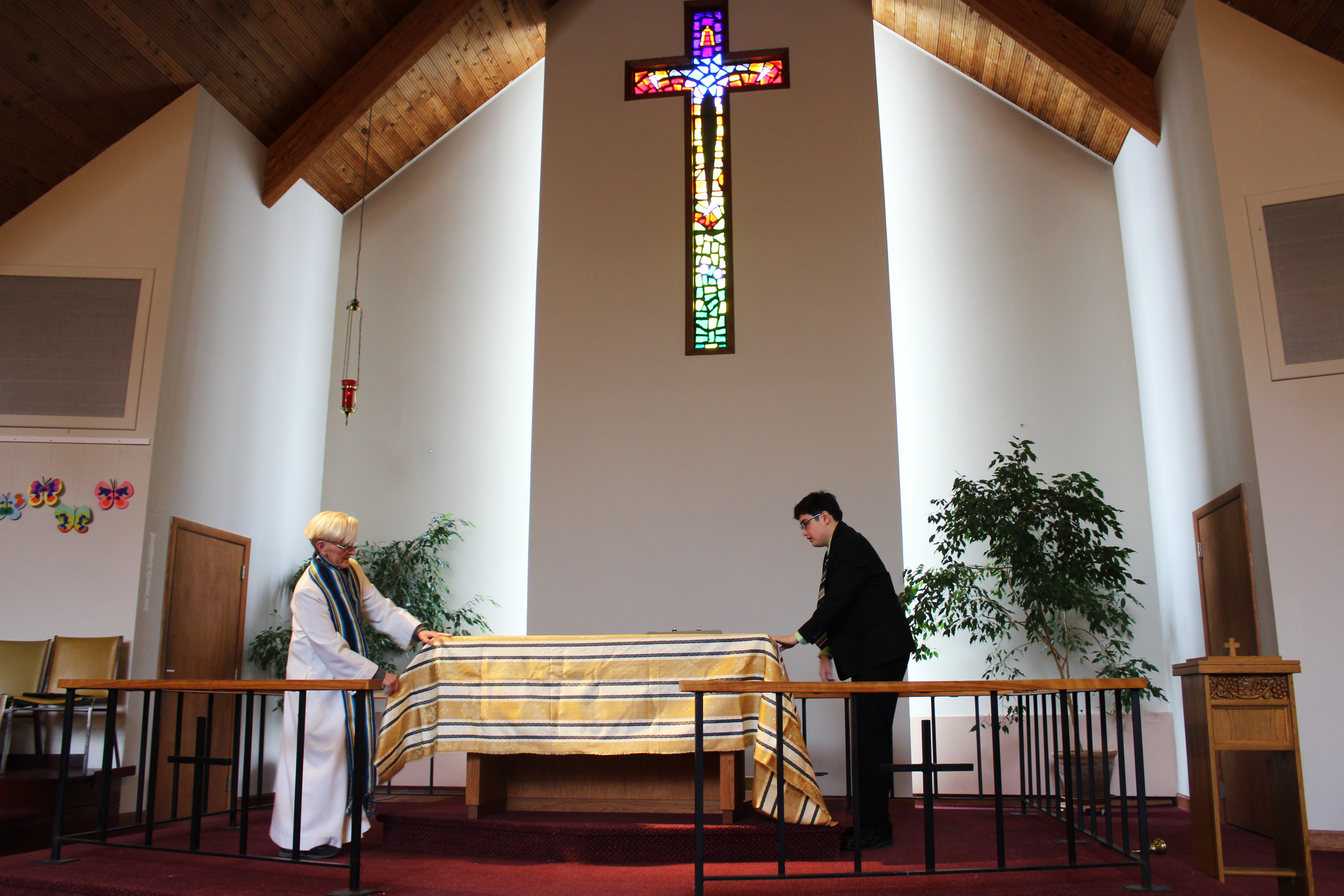 Our Easter morning service began with an empty altar, except for the cross covered with a black shroud. When the Rev. Casey Collins walked to the front of the sanctuary, she removed the cross with its shroud and then, with the help of Preston Stewart, covered the altar with a gold-colored cloth and put back in place the candles and the Bible.