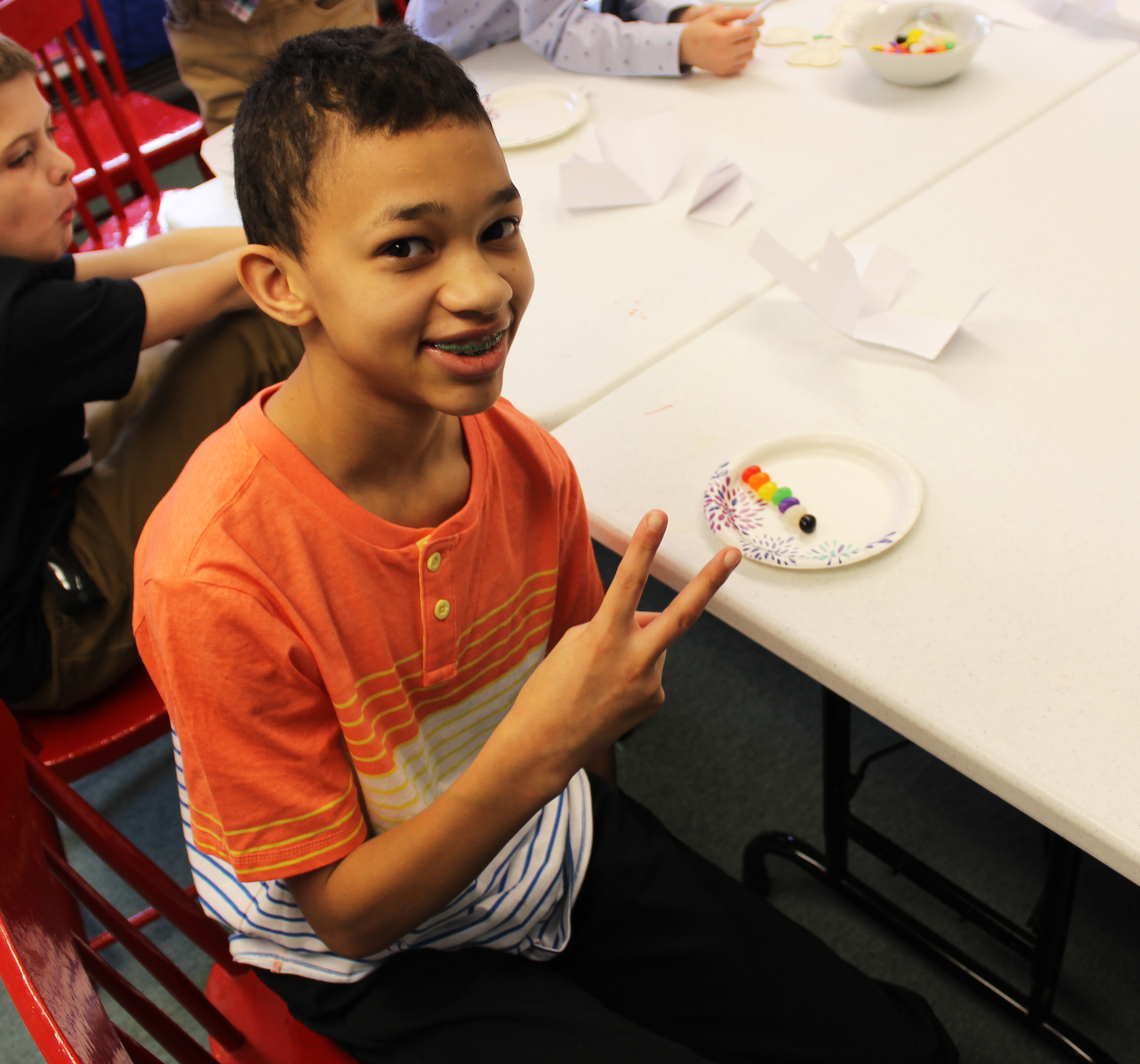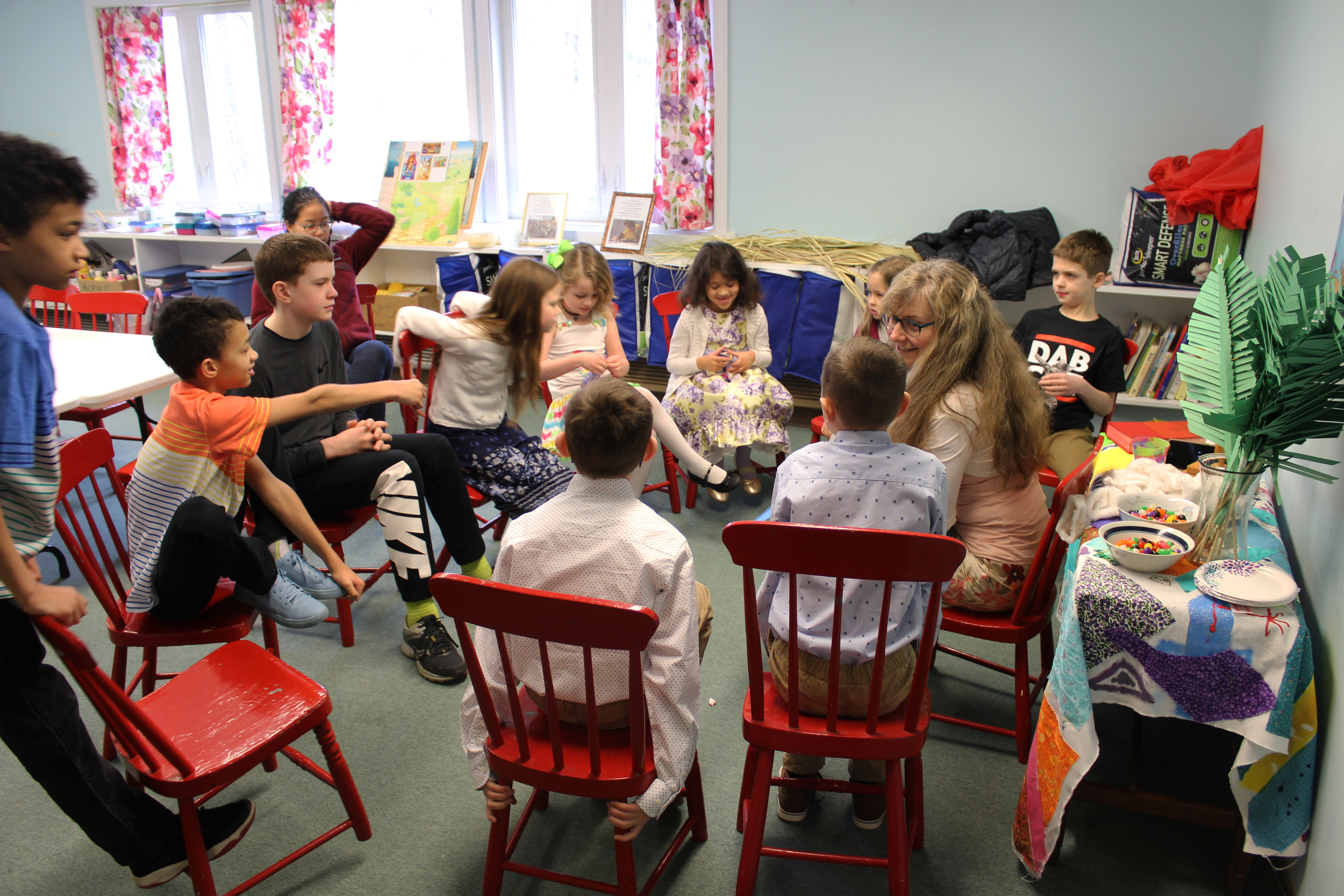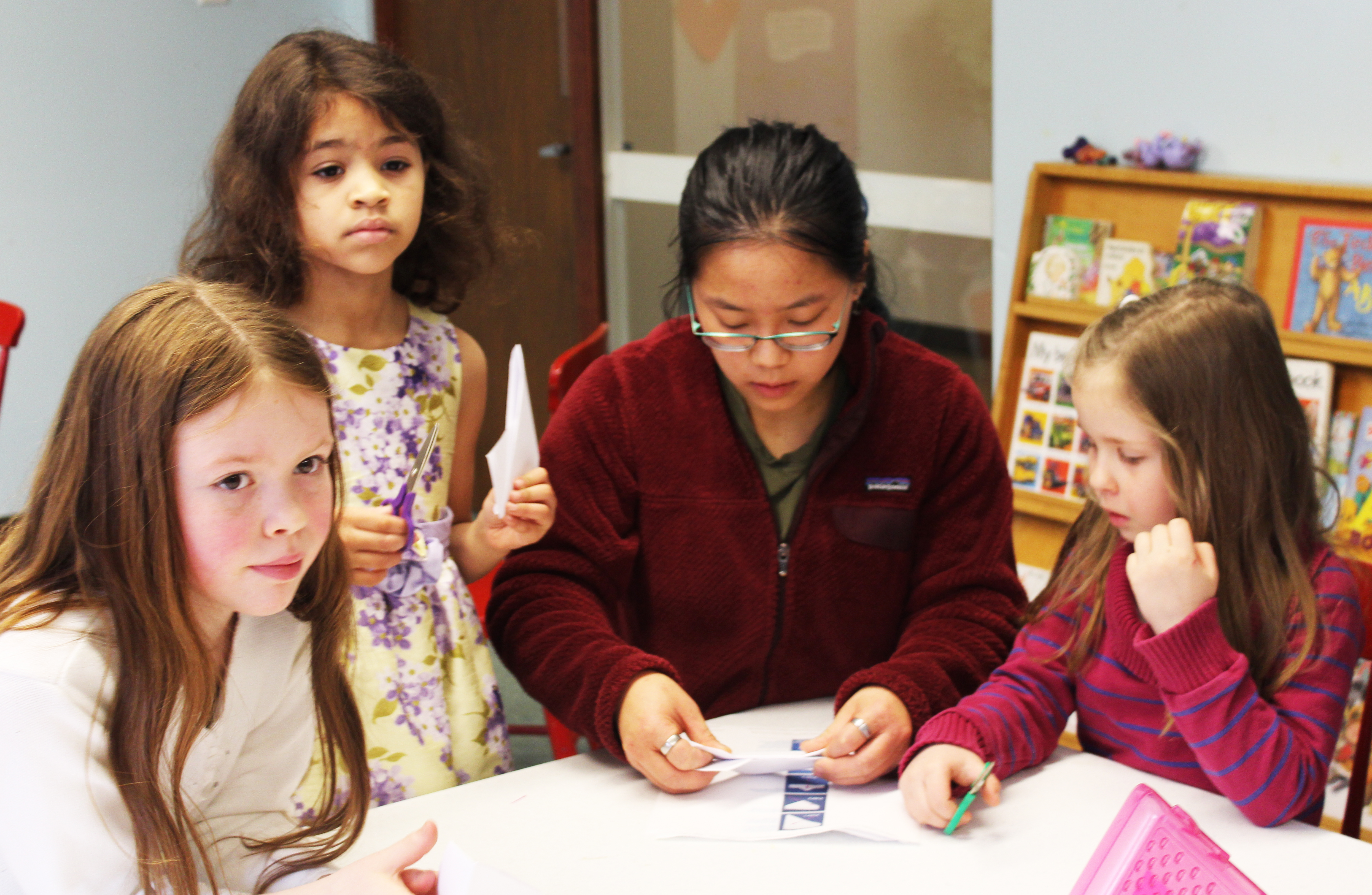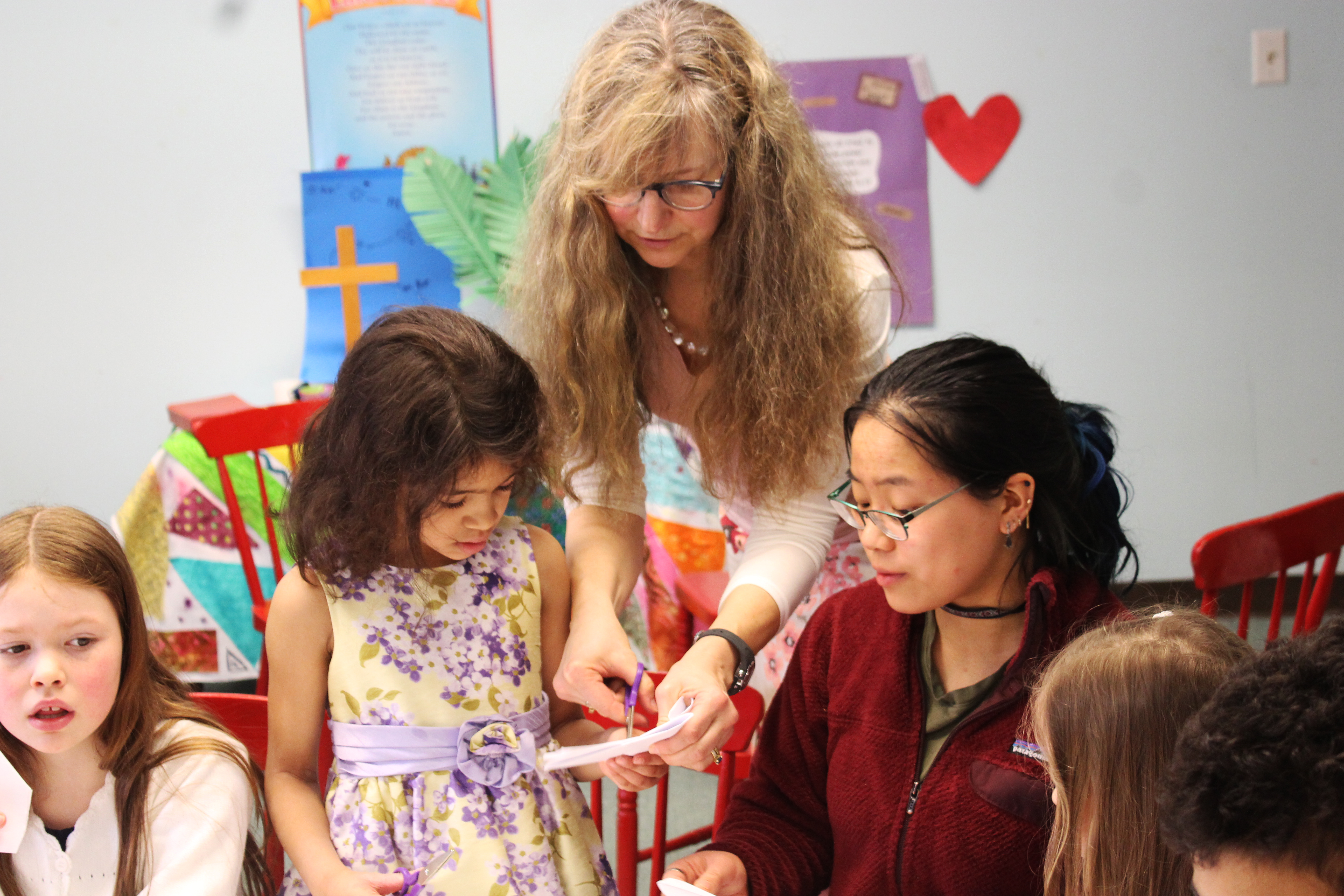 In Sunday School, Carol Hubbard led the children in an exercise of folding a sheet of paper over and over in different directions, cutting off one corner and then unfolding the paper to reveal a cross.