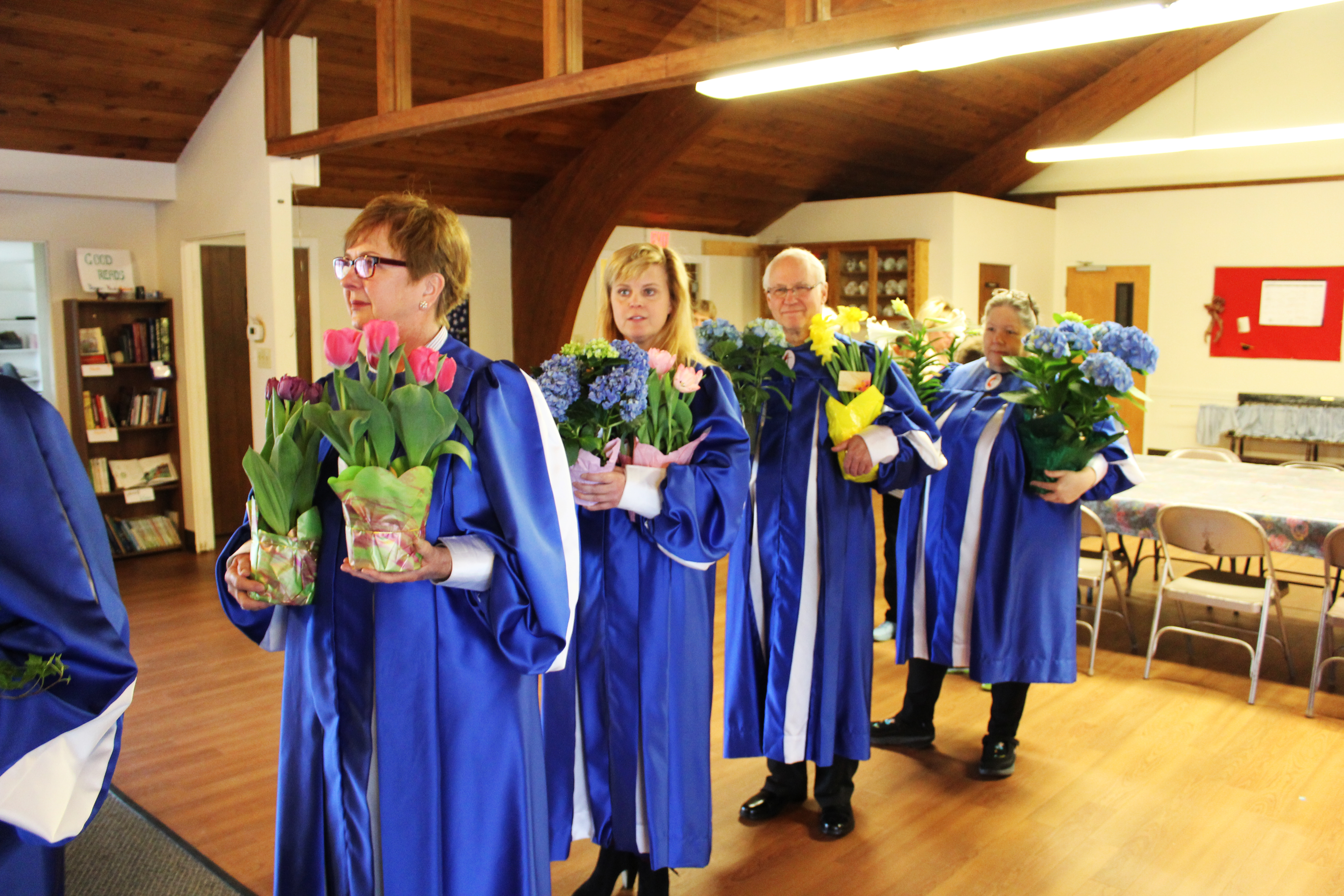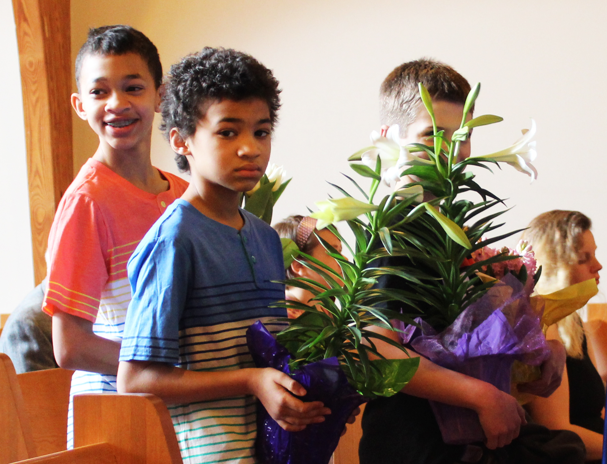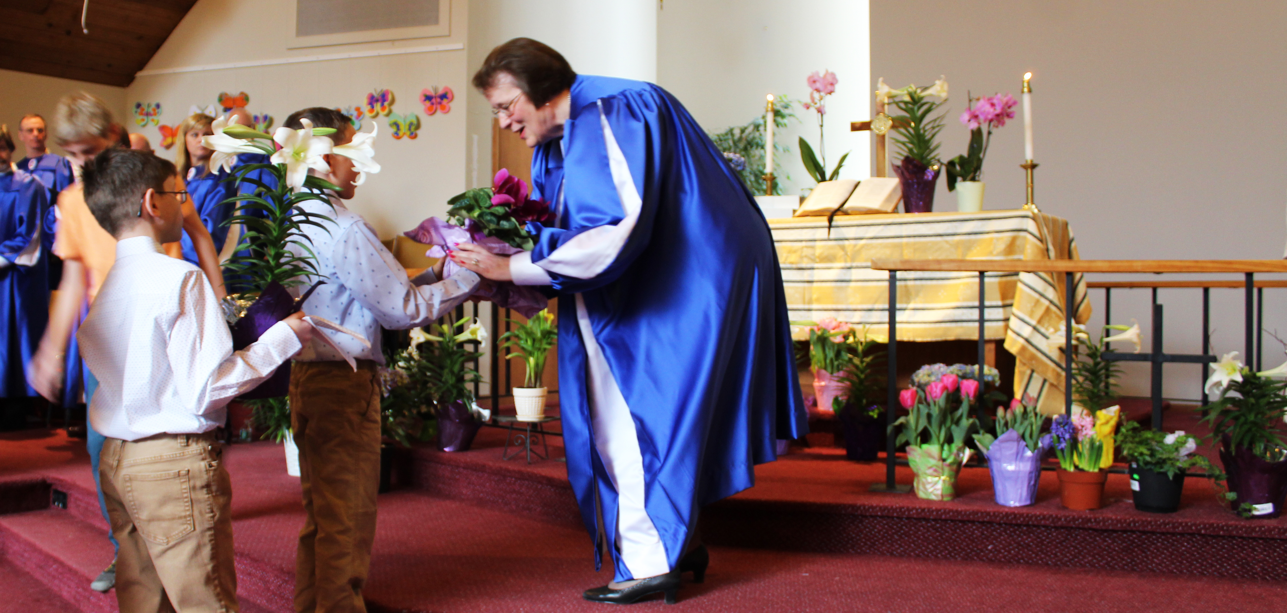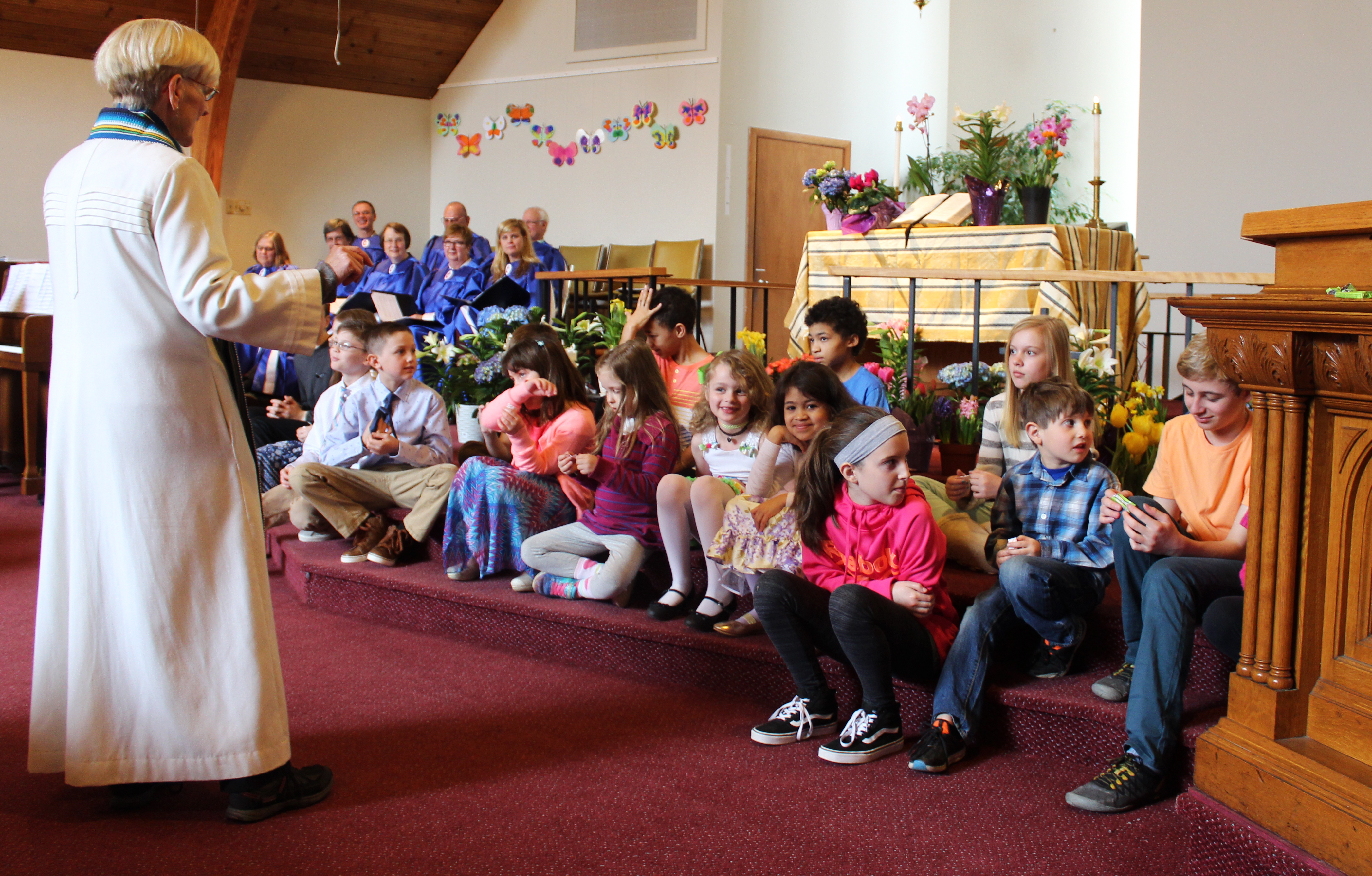 Early in the service, Pastor Casey carried the resurrection theme into the Children’s Story. She explained that when she was growing up, instead of jelly beans and chocolate, she often received packets of chewing gum on Easter to illustrate the sticky situation Jesus was in when he was crucified. As she continued the story, she opened up new packages of gum in front of them and passed out the sticks of wrapped gum to each of the children. Much to their surprise, when they opened the wrappers, nothing was inside. Pastor Casey then explained, “That was what it was like three days after the crucifixion in the tomb in which Jesus had been laid to rest. It was empty.”