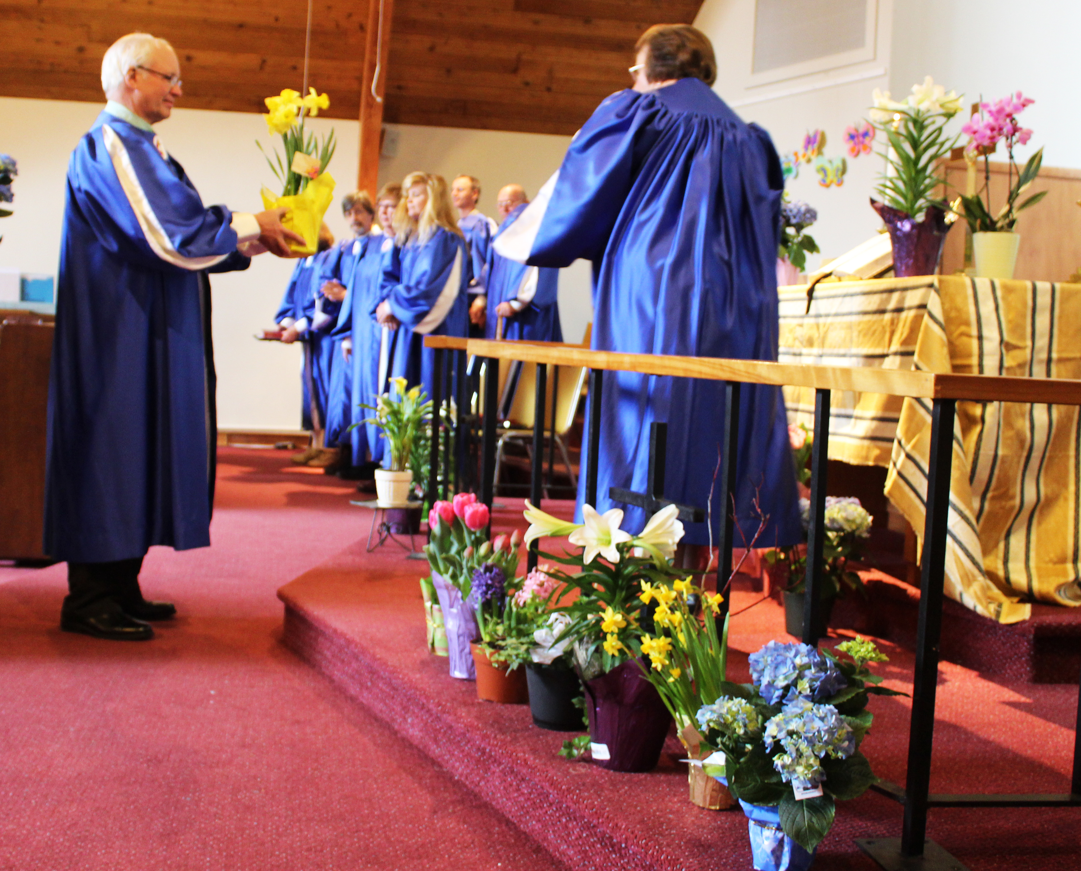 With the altar complete, from the back of the church a procession began down the center aisle — the choir, adults and children, each holding colorful flowers brought to the church in honor of loved ones. When the procession reached the communion rail, Judith Hill took each lily, daffodil, hyacinth, hydrangea and orchid and carefully arranged them on and around the altar. It was time for the celebration of resurrection and new life to begin.