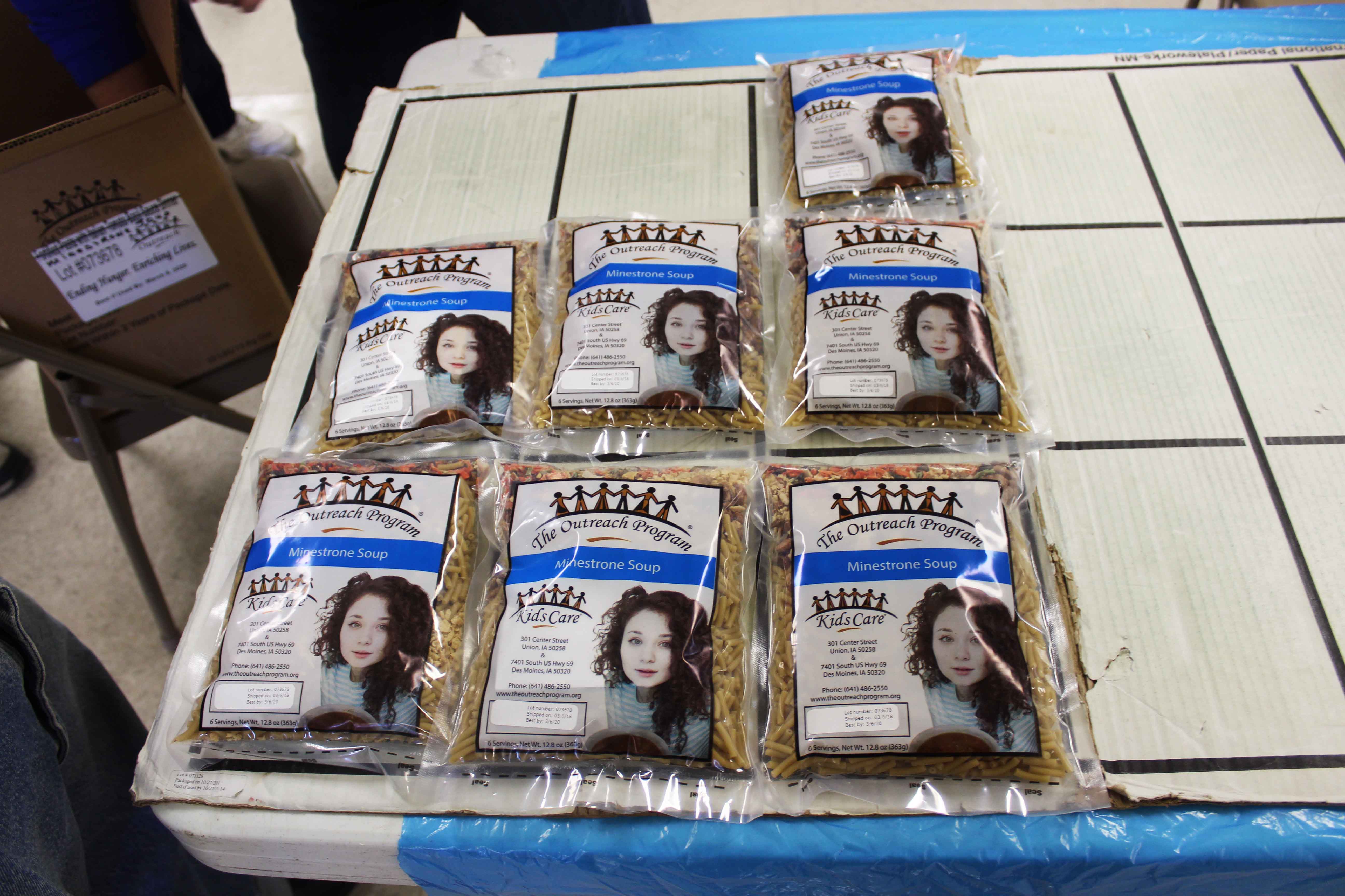 For almost two hours, our team of 11 adults and children carefully filled pouches with soy, oats, pinto beans, noodles, freeze-dried vegetables, and packets of hot sauce. The team completed 468 pouches. Each pouch contained six servings, meaning the Cape team completed ingredients for 2,808 servings of minestrone soup.