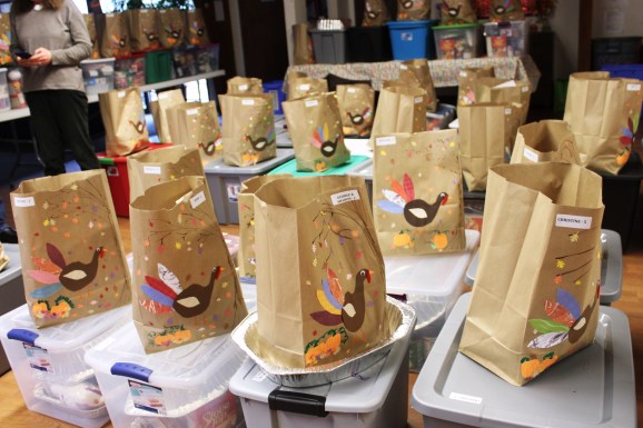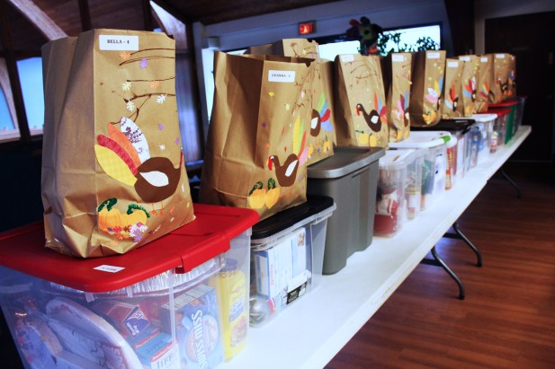 A total of 49 sets of bags with fresh produce and large bins filled with Thanksgiving fixings were spread out across the hall.