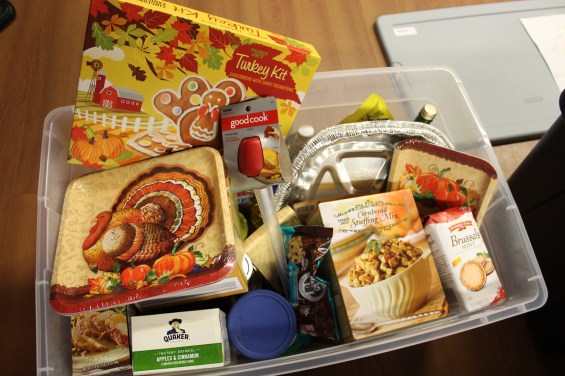 The bins included containers of stuffing, pancake/waffle mix, cranberry sauce, gravy, soups, sparkling cider, canned vegetables, Jello, salad dressings and much more. Each bin also included a gift certificate for the purchase of a turkey or anything else the family would like.
