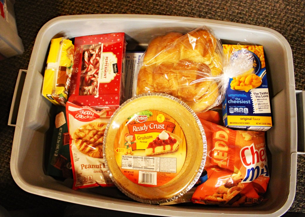 The bins were filled with everything for a holiday meal from stuffing, cranberry sauce, dinner rolls, pie shells and pumpkin, gravy, canned vegetables, biscuit mix, hot chocolate, sparkling cider, candies and nuts and more.