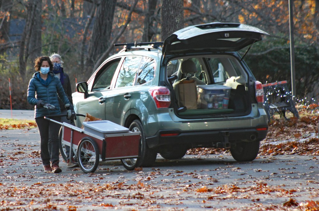 On Tuesday afternoon, Pantry clients drove to the church parking lot, lined up in their cars, and the individual bins and bags were carted out by Pantry volunteers and placed in the trunk of each vehicle.
