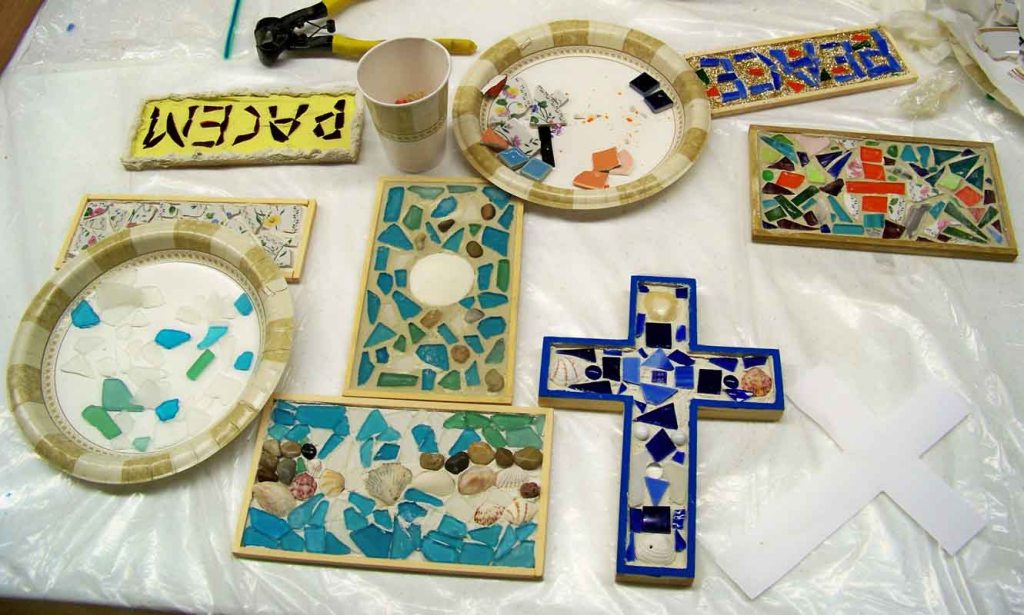 Our church experienced a taste of what Priscilla had developed within the Spiral Arts community in 2009 when she worked with a three-night intergenerational group at Vacation Bible School to create mosaics, using objects found along area beaches. Some of those mosaics are still on display in the Sunshine Room and along the back hallway near the Chapel.