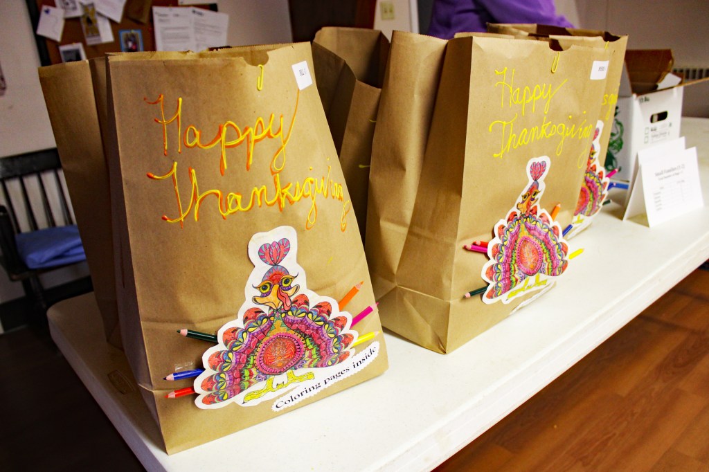 Each of the produce bags were decorated by Lisa Stevens and her daughter Rosie. The decorations included colored pencils to use on Thanksgiving-theme drawings inside the bags.