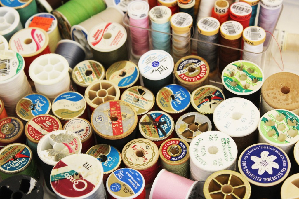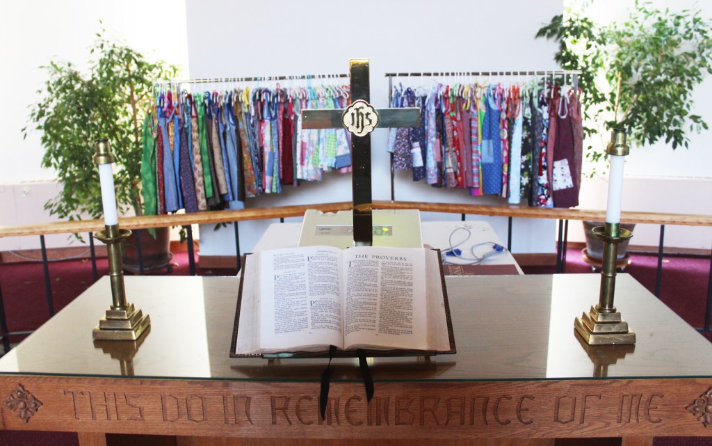 Completed dresses are on display in the church’s sanctuary.
