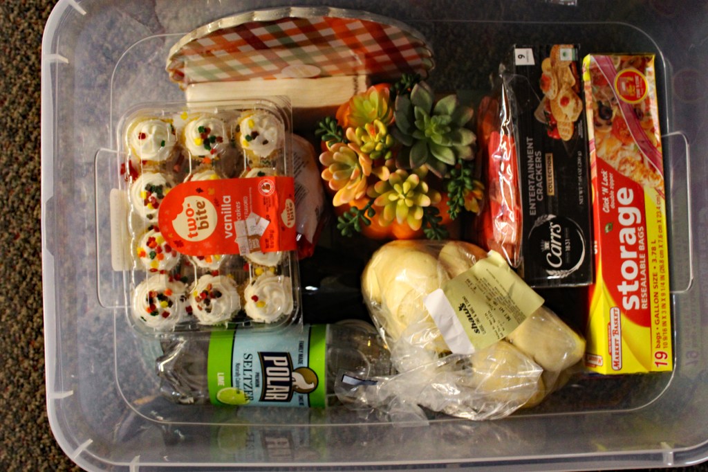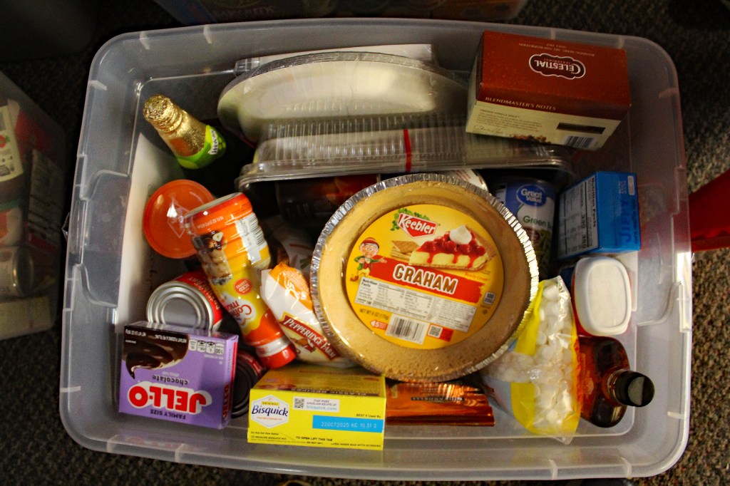 The food drive begins with Amy Lombardo and Jen Tinsman networking with families throughout Cape to provide bins of food including stuffing, cornbread mix, cranberry sauce, gravy, apple and pumpkin pie fillings, pie shells, dinner rolls, hot chocolate mix, dates and nuts, sparkling cider, dinner mints, roasting pans, Thanksgiving plates and napkins, and even more.