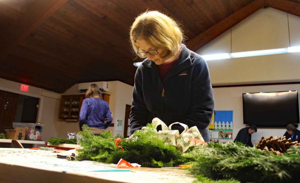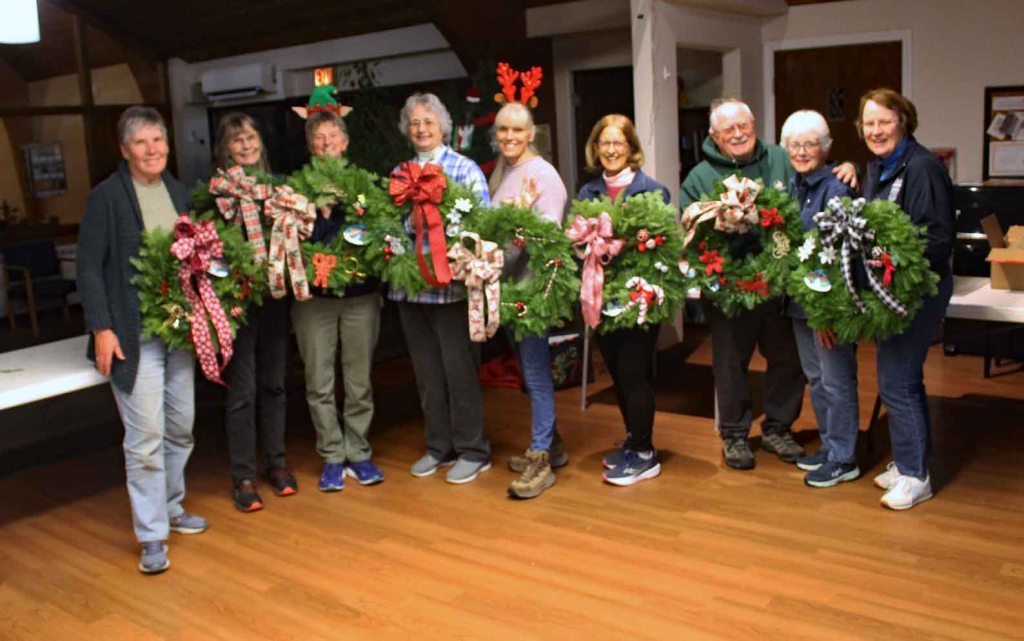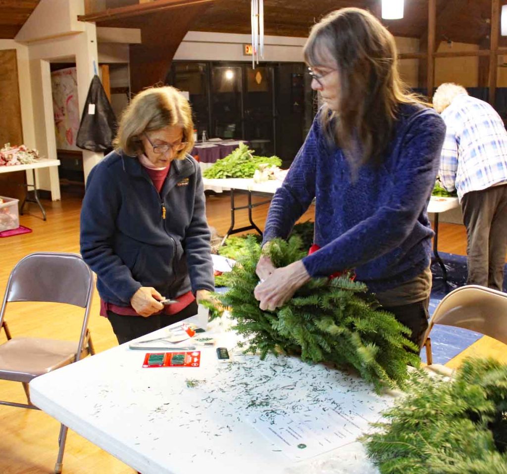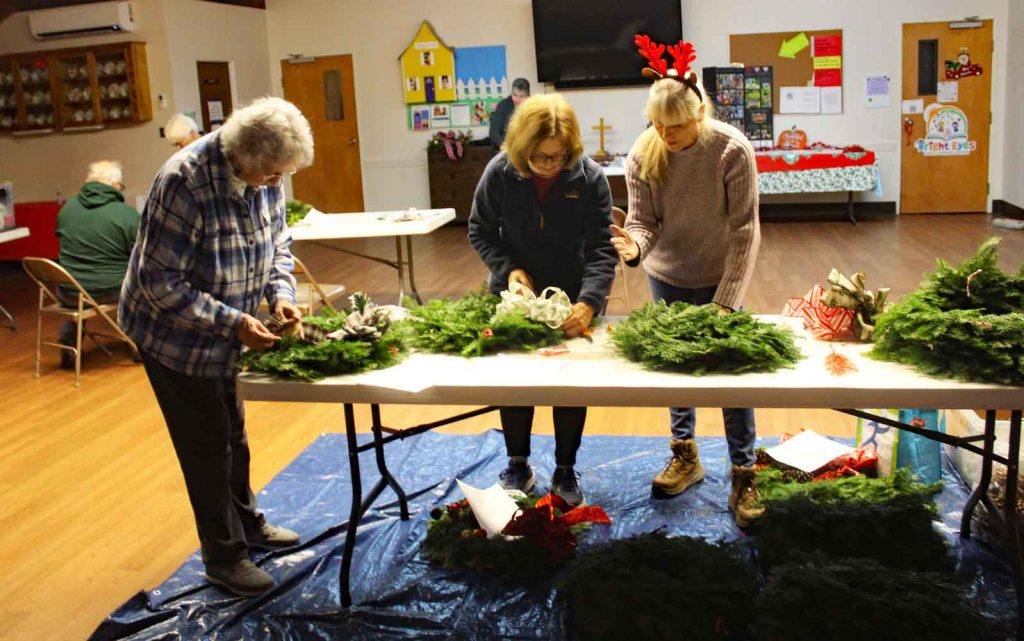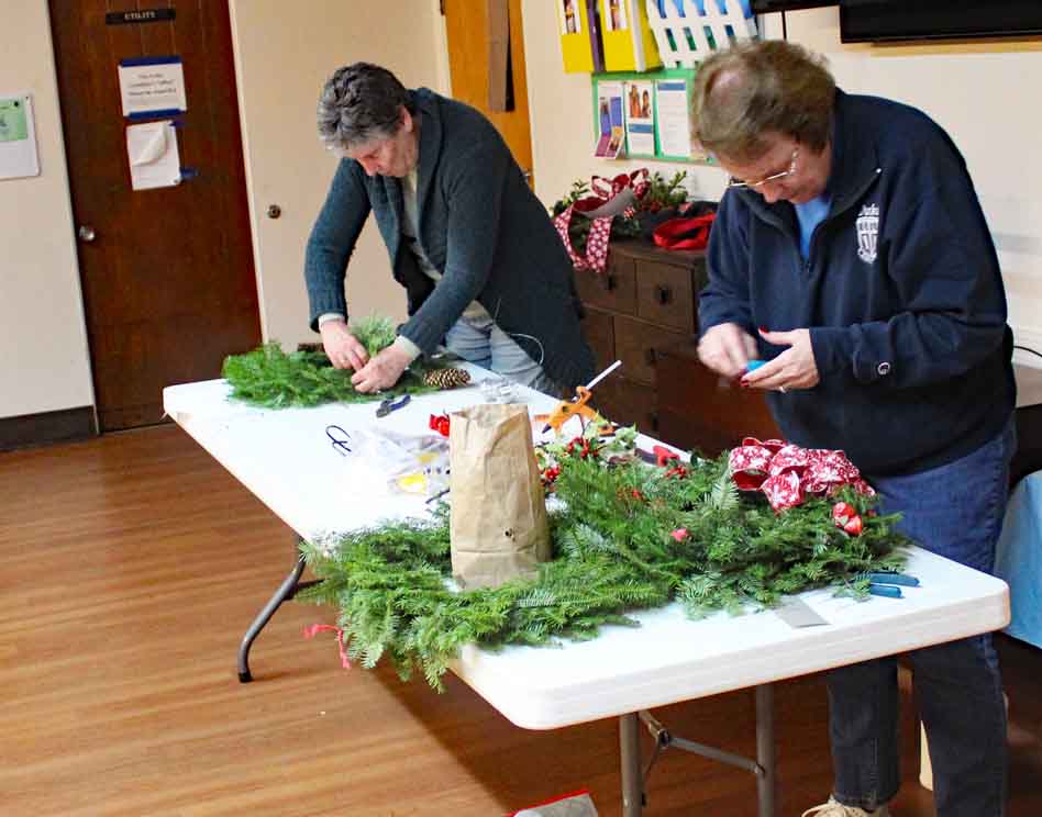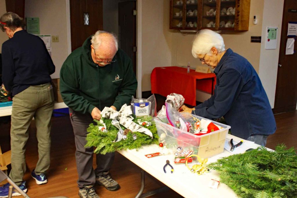 Steve and Judith Hill picked up the wreaths from McPhee’s Wreaths in Woolrich on Dec. 4 and the wreaths were decorated the following evening in Fellowship Hall.
