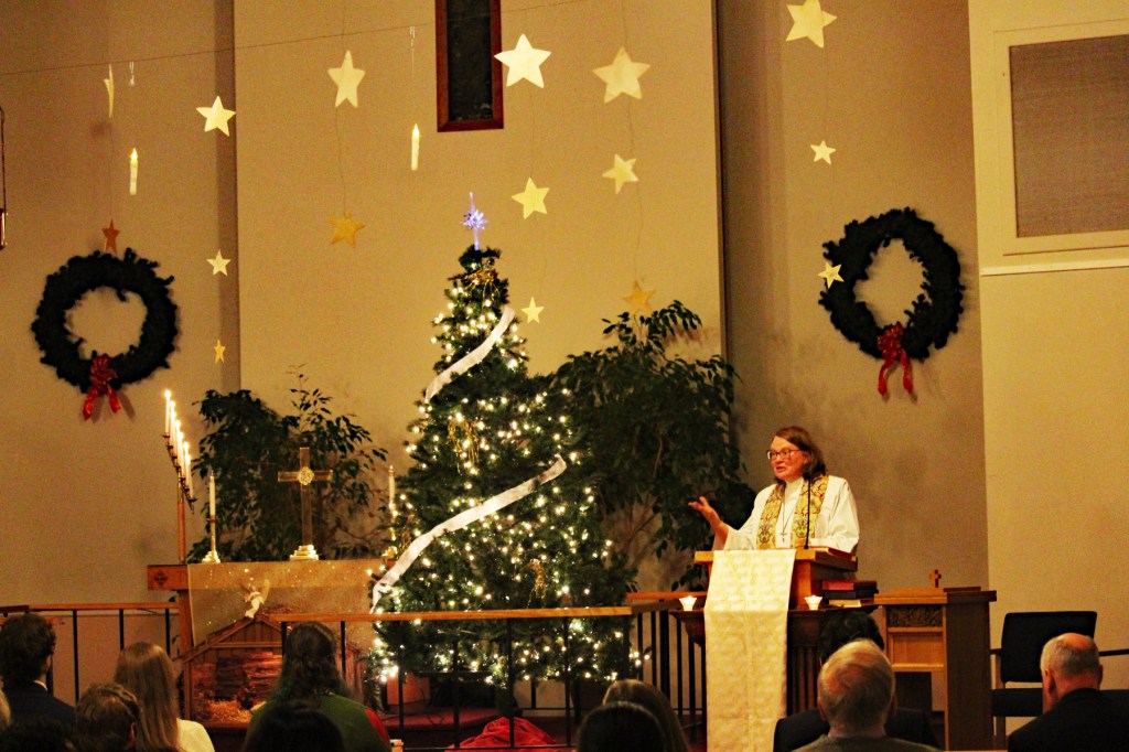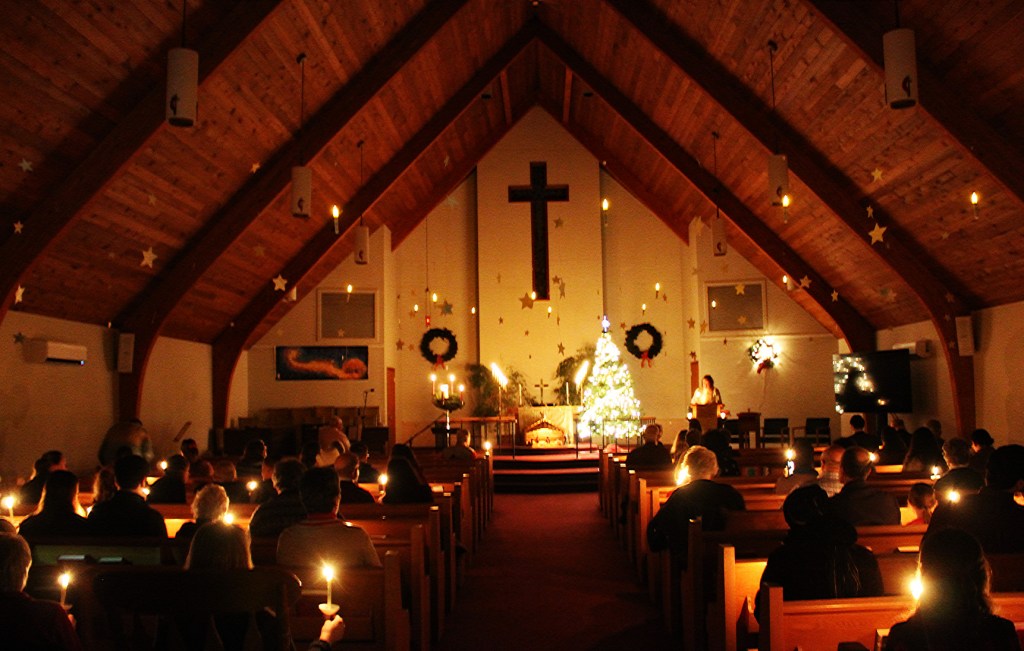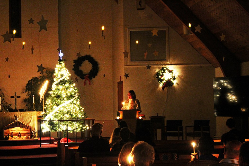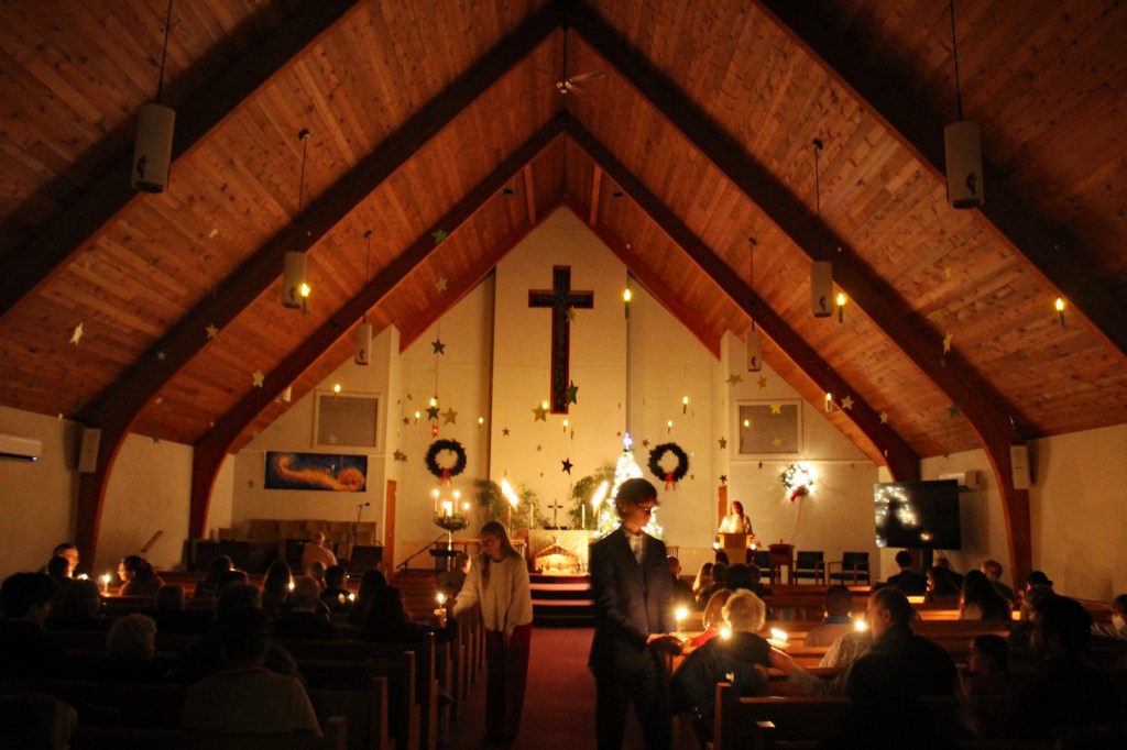 Christmas Eve was a splendid combination of scripture readings from Preston and Tim Stewart, caroling, hymns led by Stephen Bither on the piano, an inspirational message from Pastor Kathleen, the candlelight singing of Silent Night” and fellowship afterward with refreshments provided by the Braun family.