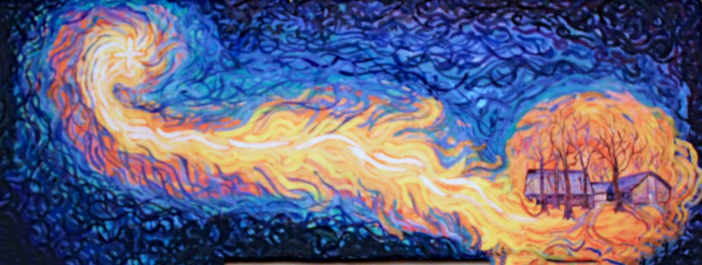 Carol Hubbard’s Christmas mural of God’s light coming into the world, focusing on our church, was displayed behind where the choir sits.