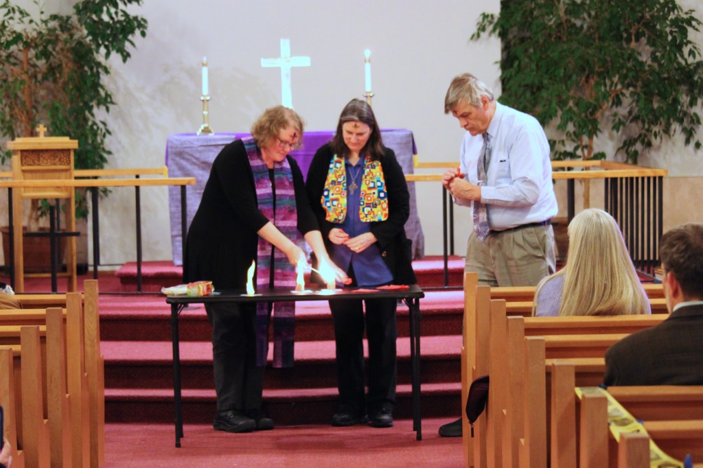 Following the supper there were break-out groups to openly discuss Lent and what and what the six weeks leading to Easter means to each of us. Those thoughts and prayers were written on slips of paper which were rolled into small cylinders during worship. The three ministers then lighted each paper cylinder one by one and watched as the prayers turned to ash and floated upward as offerings to God.
