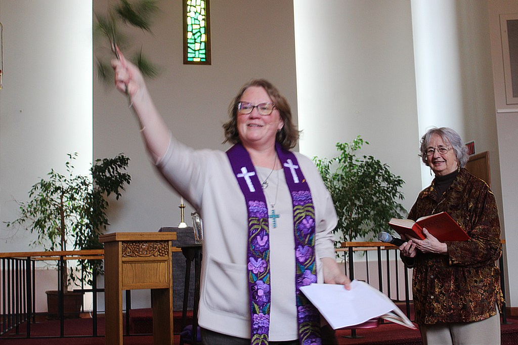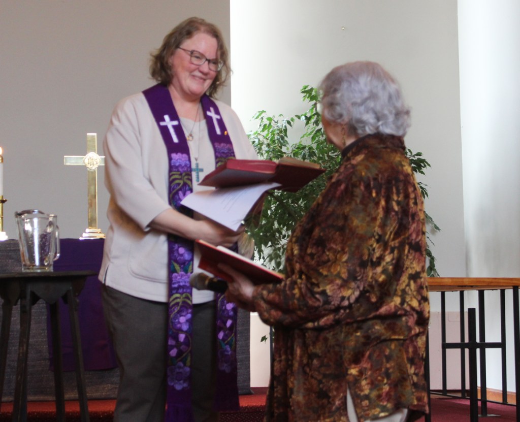 During the ceremony, Pastor Kathleen sprinkled water from a pine bow on Carol and all members of the congregation “to remember your baptism and be grateful”. Welcome, Carol!