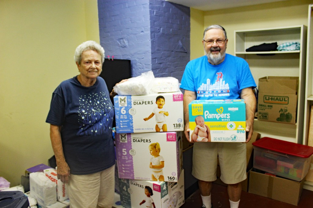 Last week, Steve went out and purchased $150 worth of diapers to be used at Family Promise’s monthly food and supplies distribution to approximately 35 families at Portland’s St. Luke’s Episcopal Church. He delivered the diapers to Linda Anderson (pictured with Steve above), who is on the Family Promise Board and coordinates its diaper distribution.