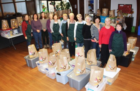 Pantry volunteers with Thanksgiving gift bags and bins willed with Thanksgiving fixings.