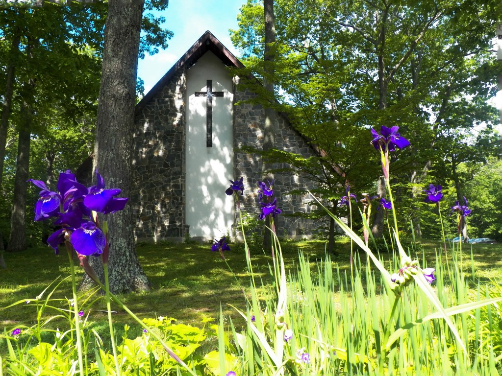 The main sanctuary includes a high-arched ceiling and a stained glass cross. The 10 a.m. Sunday service is held in the sanctuary.
